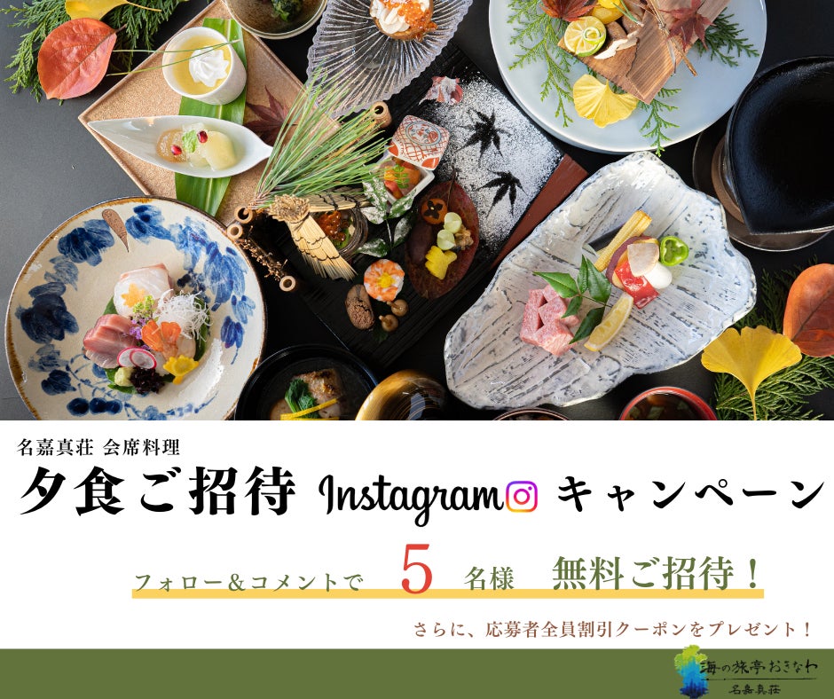 海の旅亭おきなわ名嘉真荘(本社:北海道札幌市、代表:富島 誠一)では、公式インスタグラムをフォローいただき、対象投稿にコメントをいただくと、抽選で5名様に夕食の会席料理を無料でお楽しみいただけるキャンペーンを開催中です。