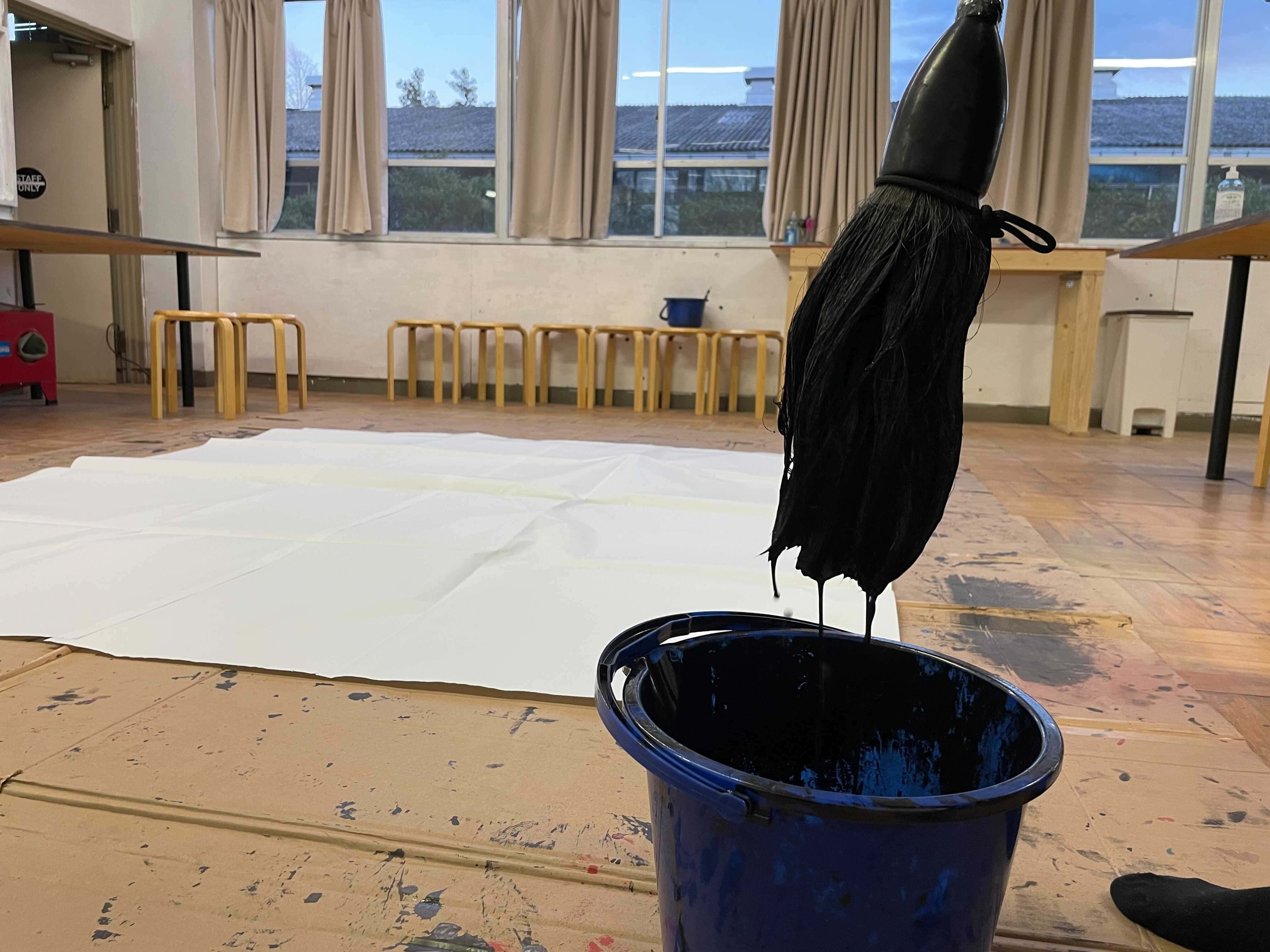 普段とは異なる大きな筆を使った巨大書道体験。チームワークが求められ、テーマに沿った作品を協力して作り上げるアクティビティです。