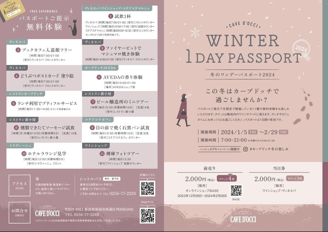株式会社カーブドッチ(本社:新潟県、代表取締役社長:今井 卓)は、2024年1月5日~2月29日の間に利用できる「冬のワンデーパスポート」を発売します。ワインの樽庫にご案内するフォトツアーや、普段は見ることのできないビール醸造所の見学、自家製パンの石窯見学と焼きたてパンの試食体験ツアーなどのイベントに参加できます。さらに、ヴィネスパブックカフェが一日中利用できる他、フードやドリンクに使える3枚のチケット付きで滞在中に利用できます。合わせて、冬のワイナリーステイを楽しむ「冬限定2つの特典付き宿泊プラン」も2024年1月5日~3月31日まで販売します。