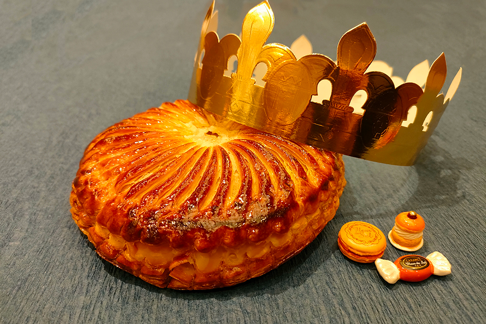 「ガレットデロワ」とはキリスト教の祝日1月6日の公現祭をお祝いして食べられる新年には欠かすことのできないフランスの伝統的な菓子です。フランス語で「王様のお菓子」を意味し、中に隠された「フェーヴ」という小さい陶器の人形が当たった人は王様として王冠をかぶり、幸福な1年を送ることができると言われています。