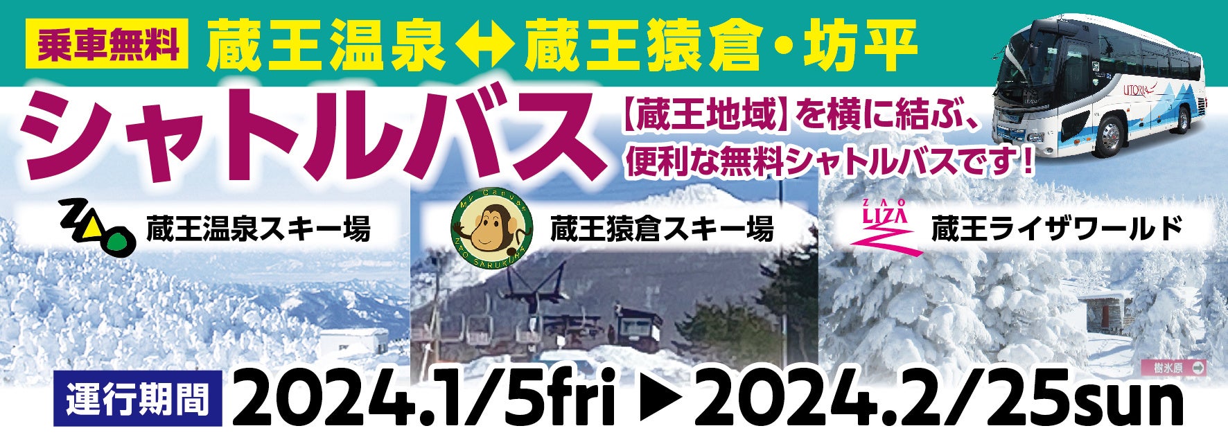 「世界の蔵王」プロジェクト実行委員会の委託を受け山交バス株式会社では、蔵王地域における二次交通の試行事業として、下記のとおり蔵王温泉と蔵王坊平・猿倉を結ぶシャトルバスを期間限定で運行いたします。多くの方のご利用をお待ちしております。