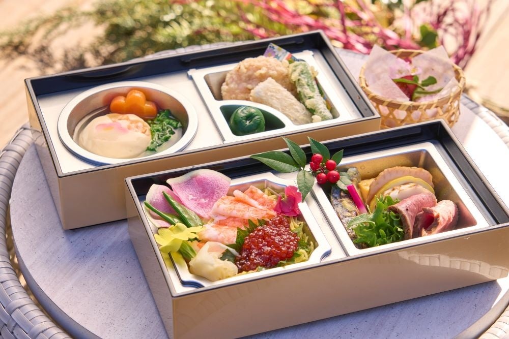 『Sport & Do Resort リソルの森』の施設内にある梅園では、約7,000坪の広い空間に、蝋梅、紅梅、しだれ梅、豊後梅、白加賀梅、野梅、緑縁梅など、約450本の梅の木が立ち並び、毎年1月下旬ごろ開花し、2月中旬から3月上旬にかけて見ごろを迎えます。そんな梅園でのお花見ピクニックをより気軽に楽しんでいただけるようにと、「翠州亭」では2022年より「梅のピクニックBOX」を販売。筍や菜花、春を告げる鰆など、春の彩り豊かな食材をふんだんに使用し、見た目にも心がうらかかになる特別な梅見弁当となっています。