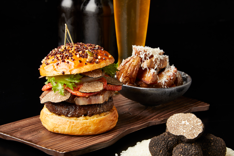 ふんわりと焼き上げた自家製ブリオッシュバンズに、国産牛のジューシーなパティ、神奈川県産高品質牛肉として知られる横濱ビーフを贅沢に厚切りした自家製のベーコン、黒トリュフ、フランス産の濃厚なコンテチーズを挟み、香り高い黒にんにくのアイオリソースで仕上げました。溢れ出るジューシーな肉汁と贅沢な素材が生み出す至極のマリアージュをご堪能ください。
