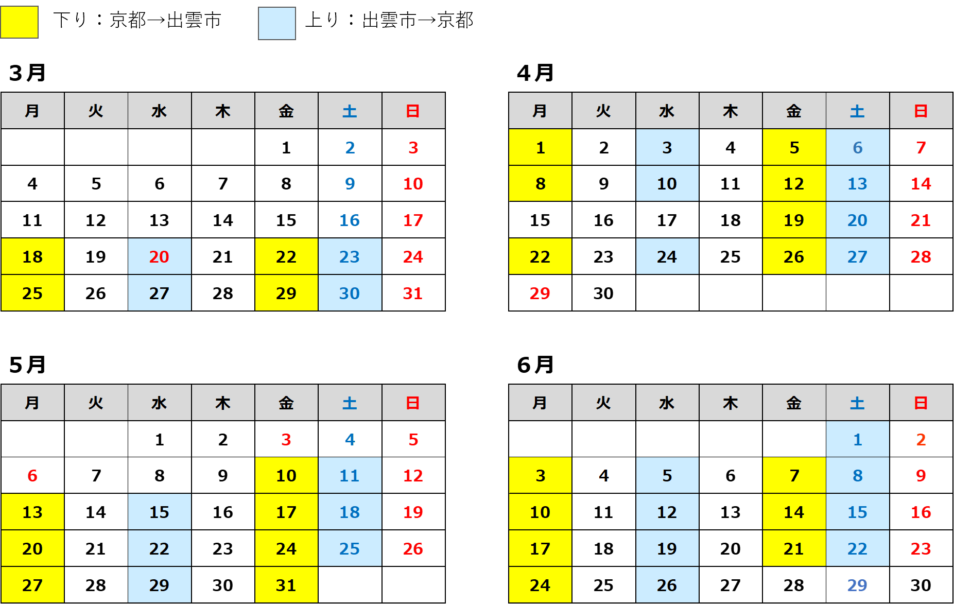 運行日カレンダー(始発駅基準)