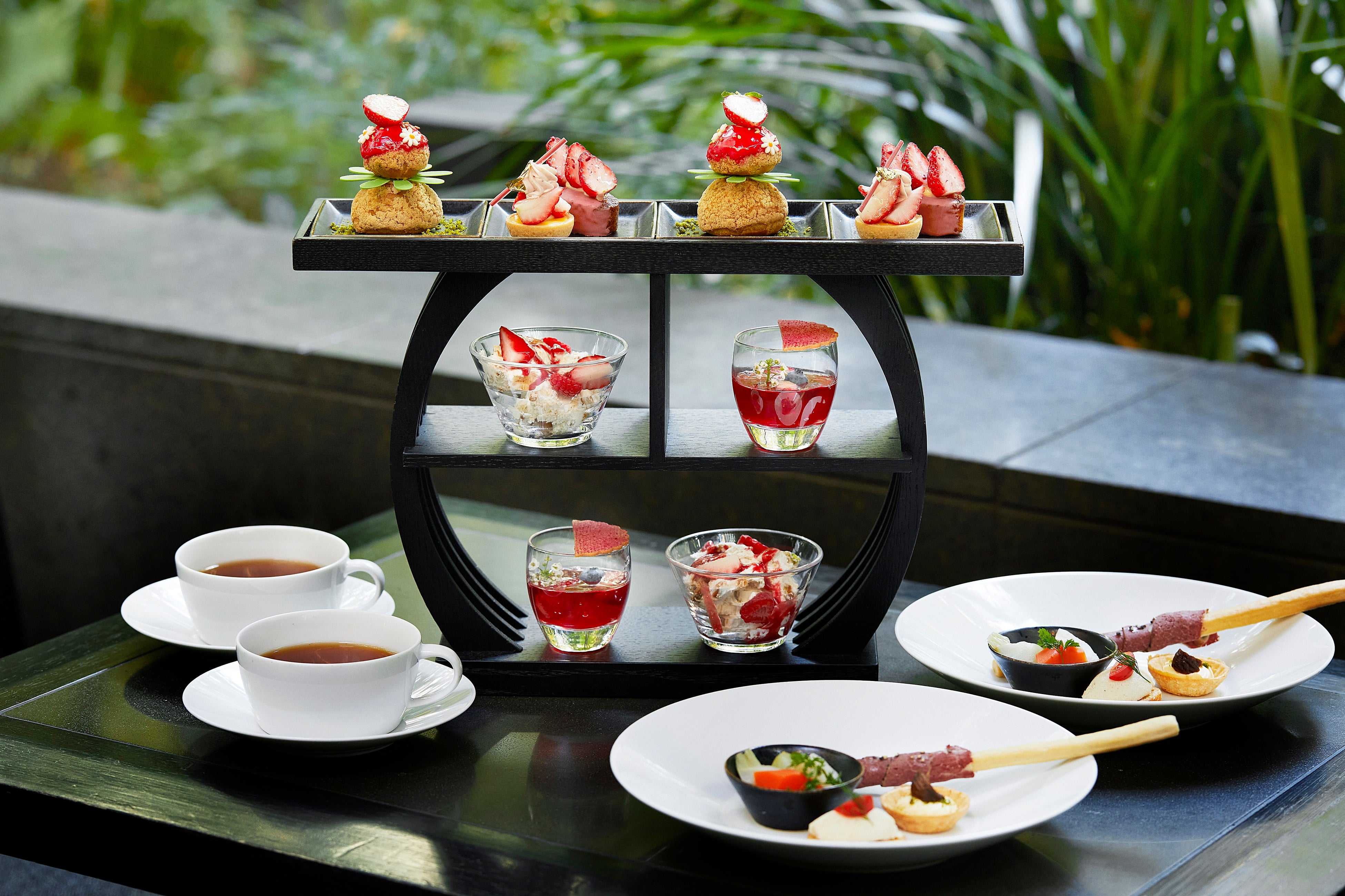 ザ・カフェ by アマンの「フォレ デセール」は、季節の果物を使ったクラシックなフランス菓子やグラスデザートを、セイボリーとコーヒーまたは紅茶とともにお楽しみいただけるデザートセットです。今回は、すべてのスイーツに旬の苺をたっぷりと使い、苺本来の甘みや酸味、そして果肉感をご堪能いただける苺づくしのメニューをご用意いたしました。