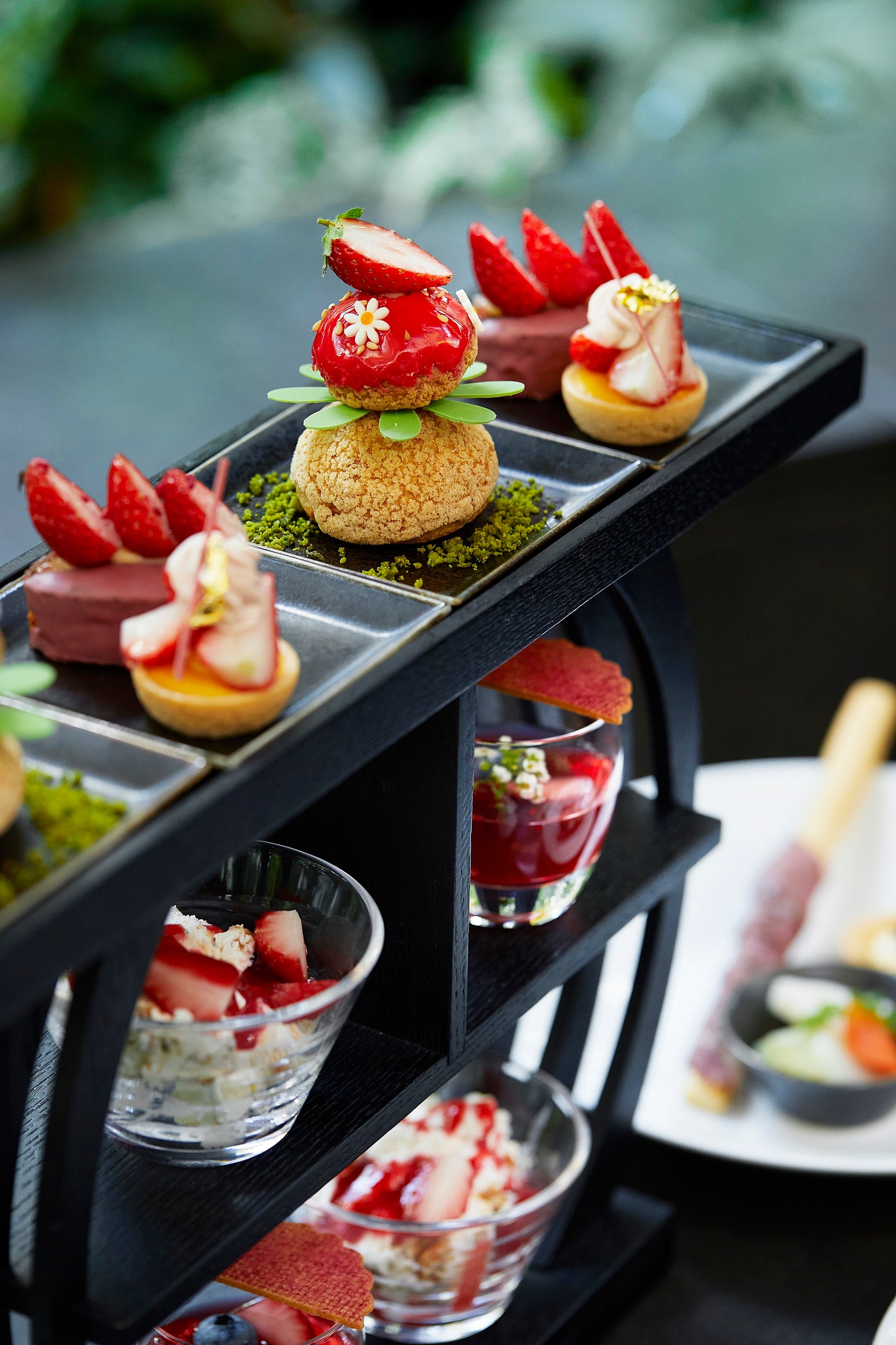 上段には、フォンダンを纏わせ色鮮やかな苺を表現したフランスの定番菓子‘ルリジューズ’が愛らしく並びます。上のシュー生地の中には、コクと甘みのあるピスタチオクリームを、 下のシュー生地の中には、苺のクリームとカットしたみずみずしい苺をたっぷりと詰めました。その他、苺のフィナンシェや、冷たいヌガーグラッセの苺ソースがけ、苺とクランベリーのジュレなど、アマン東京ペストリー料理長 井ノ上拓哉がこだわって作り上げる繊細なデザートとともに、大手町の森の中で春の訪れを感じるひとときをお過ごしください。