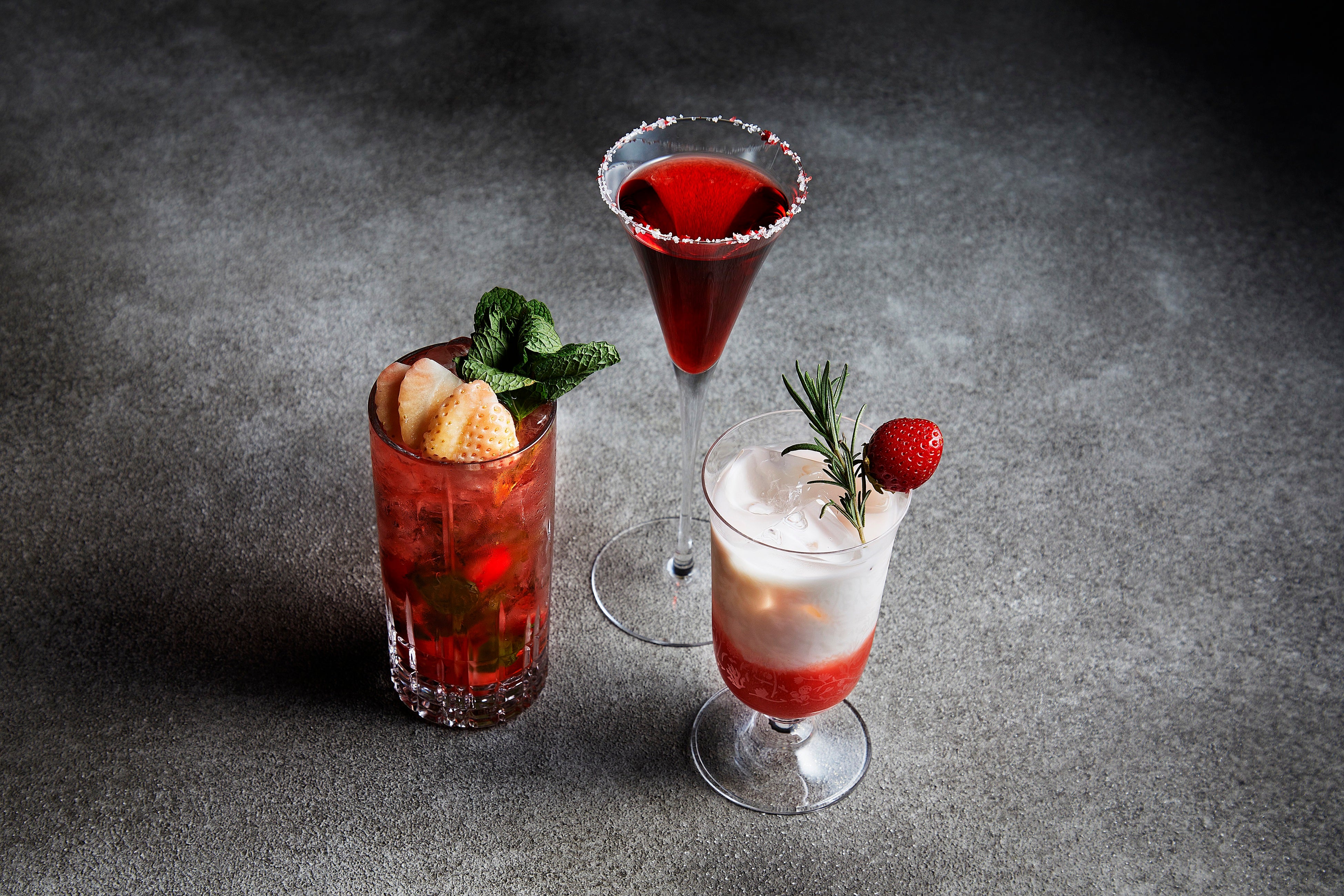 ザ・ラウンジ by アマンのバーカウンターでは、3種類のストロベリーカクテル(各3,300円/税・サービス料込み)が登場いたします。人気のマルガリータに、苺のエッセンスを加えた「ストロベリー マルガリータ」は、塩とピンクペッパーをグラスの縁に飾ったスノー・スタイルで、スタンダードカクテルにひねりを加えたユニークな口当たりをお楽しみいただけます(写真中央)。「苺のローズモヒート」は、苺の爽やかな甘みをホワイトラムで強調し、バラの花びらを添えて華やかな一杯に仕上げました(写真左)。赤と白のグラデーションが美しい「ストロベリー レイヤード」は、いちごとキャラメルのエッグノックをベースにしたシルキーな舌触りのカクテルです(写真右)。