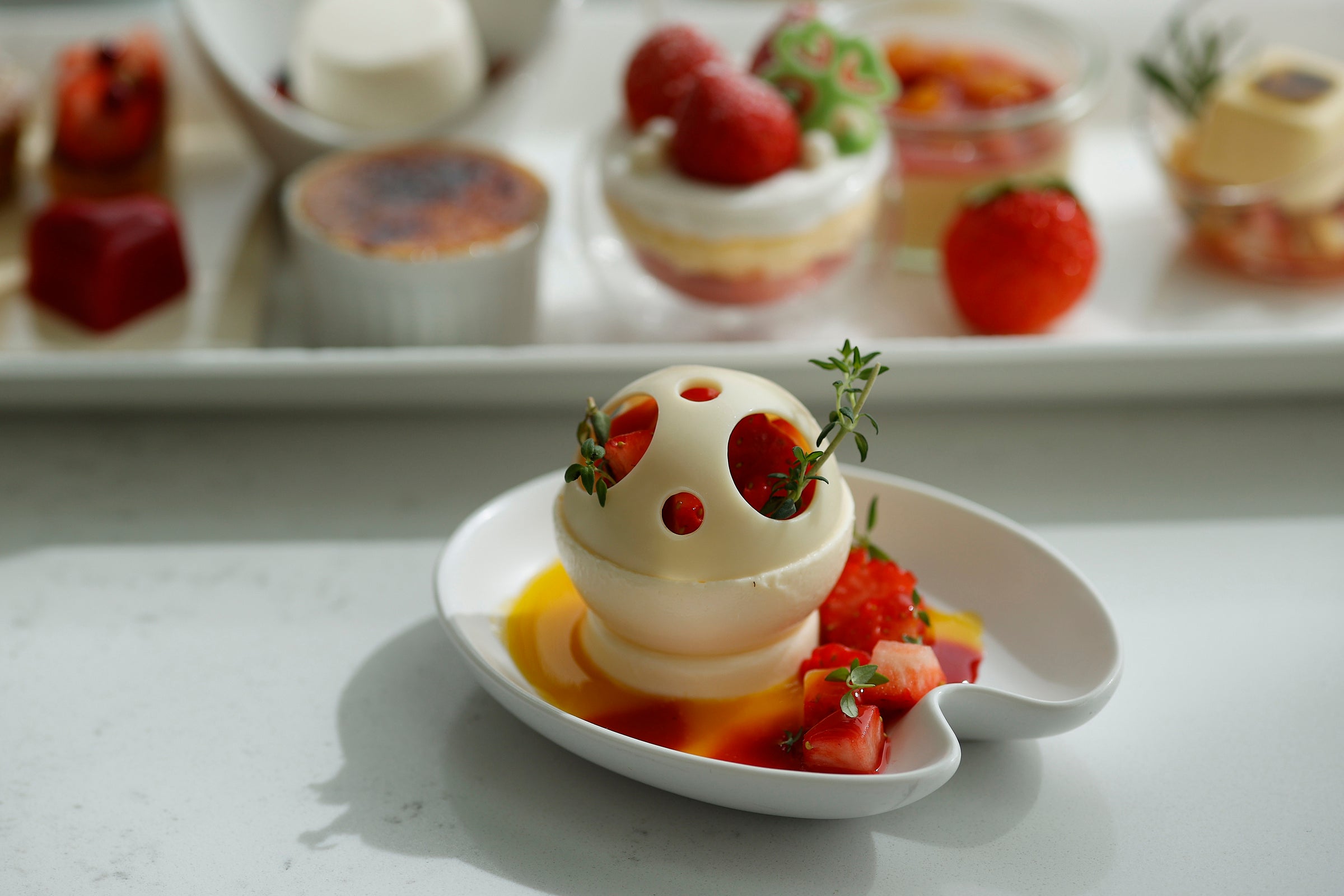 ホワイトチョコレートでつくったドームの中に苺のマリネを。ホワイトチョコレート優しい甘さと苺の甘酸っぱさにタイムを香らせた香り高く繊細な一品。