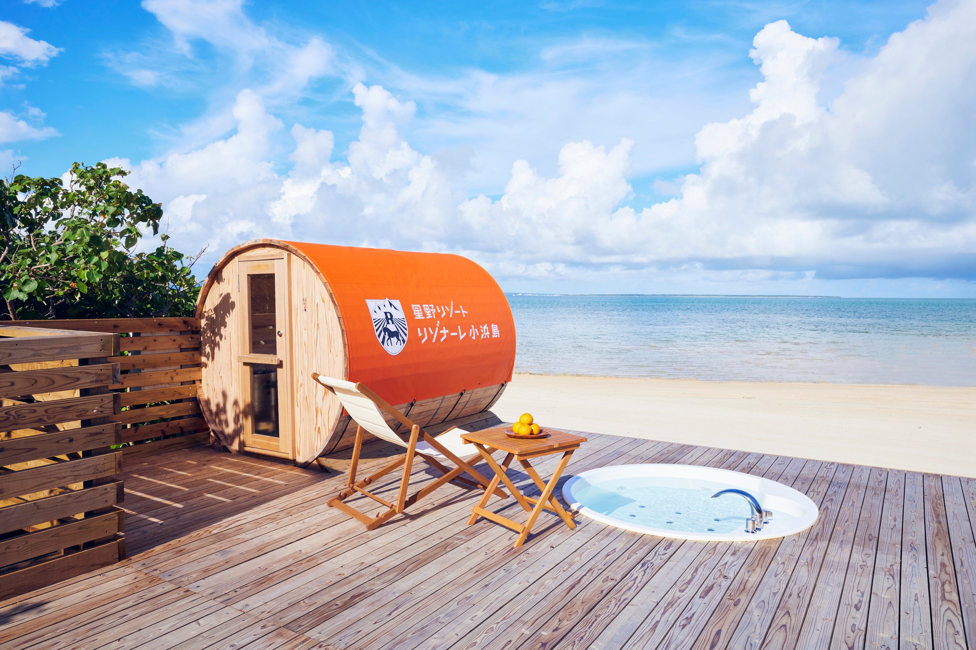 ホテルに隣接するビーチに佇むバレルサウナでは、セルフロウリュを備えた本格的なサウナ体験が可能。バレルサウナに配された全面の大きな窓からはコバルトブルーの絶景を一望できます。周囲を国内最大の珊瑚礁「石⻄礁湖」に囲まれた小浜島のロケーションだからこそ体験することができる絶景の空間です。