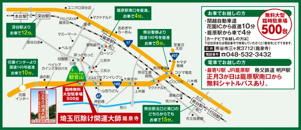 関越自動車道花園ICから国道140号線を熊谷・深谷方面に10分ほど直進すると、「埼玉厄除け開運大師」の大きな看板が見えてきますので、左折して駐車場へお停めいただけます。