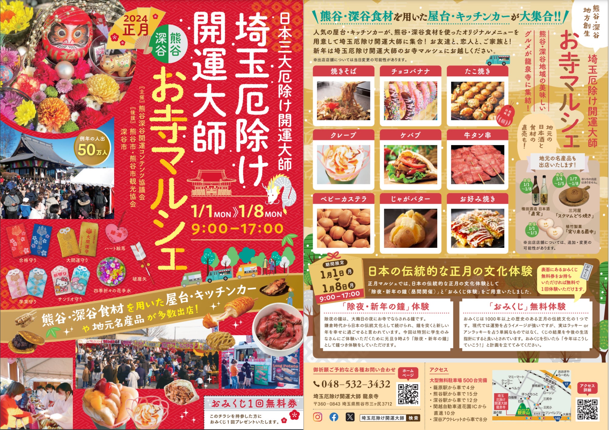 日本三大厄除け開運大師の一つとされる埼玉厄除け開運大師・龍泉寺(埼玉県・熊谷市)において、令和6年(2024年)1月1日~8日 9:00~17:30で初詣大祈願祭・だるま市が開催されます。
