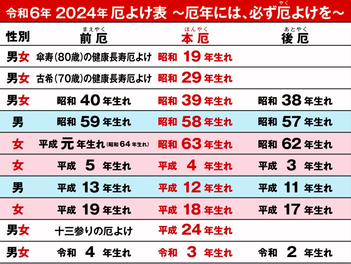 令和6年(2024年)の厄年早見表で、ご自身やご家族、周りの大切な方が厄年に該当しているかを確認しましょう。