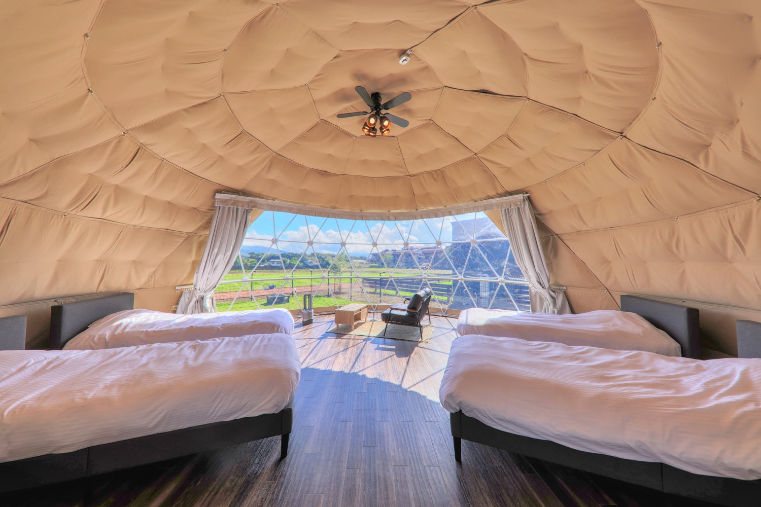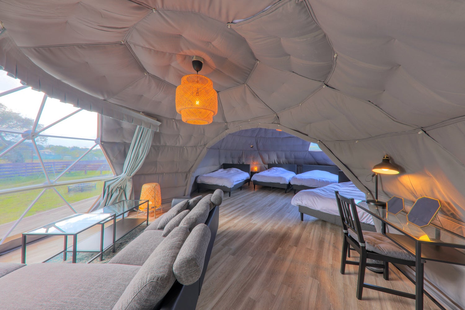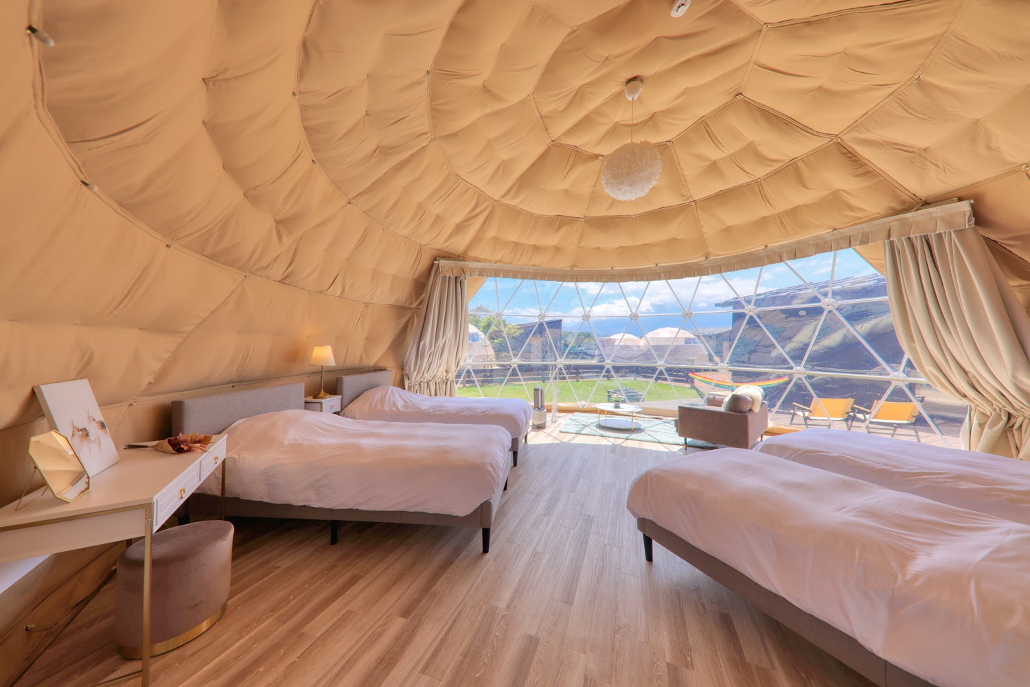直径6mのドームと5mのドームが合体した超大型ドーム型テント。 テント内にはセミダブルベッドを4台配置しており、マットレスを使用すれば最大6名まで宿泊可能です。 専用の食事スペース、シャワールーム、150㎡のプライベートガーデンも完備しておりますので、ファミリーやグループでもゆったりとプライベート空間をご堪能いただけます。