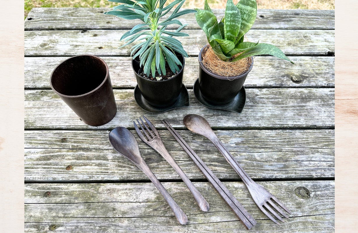 トマトの葉から植木鉢を、竹の端材からカトラリーとコップを。