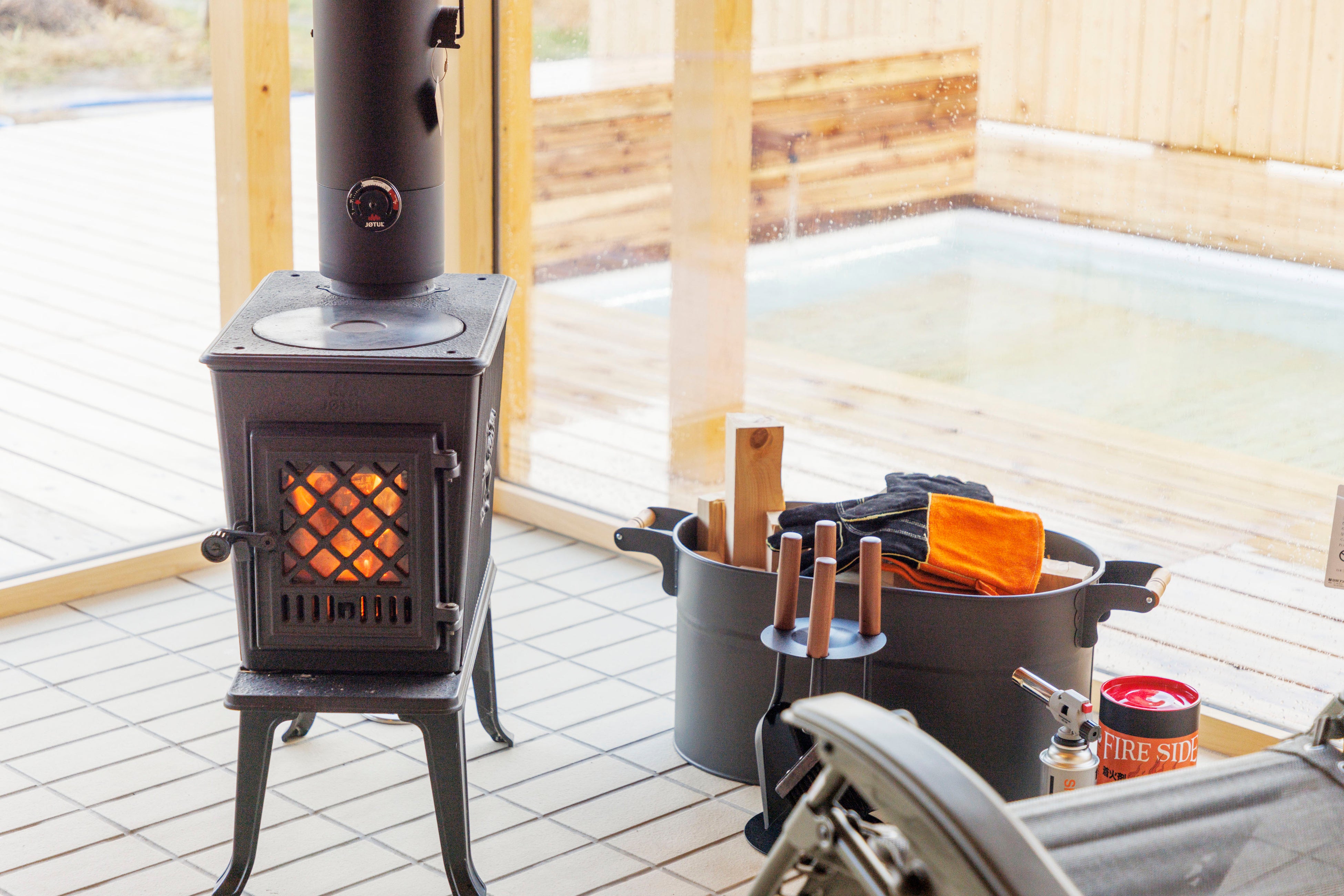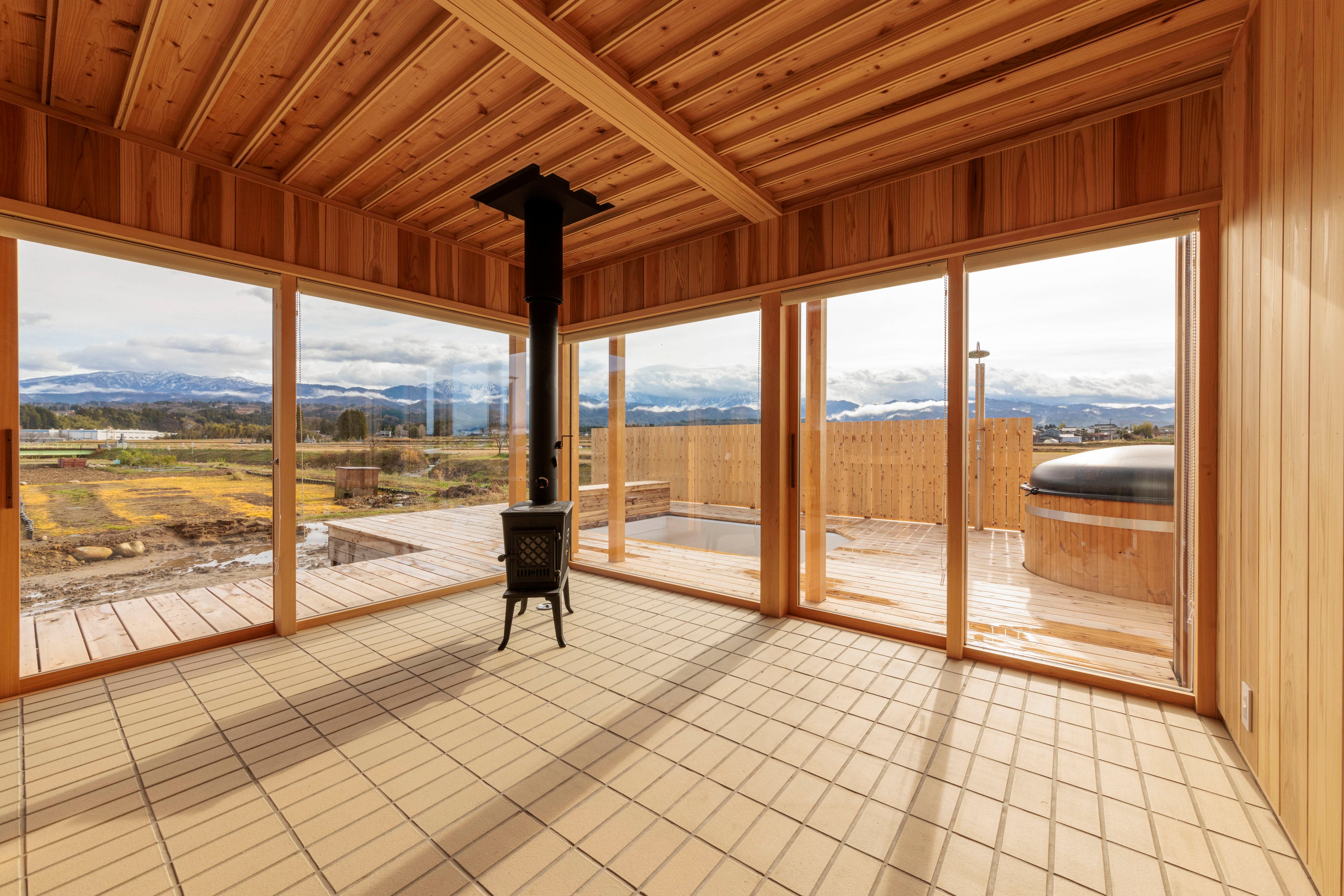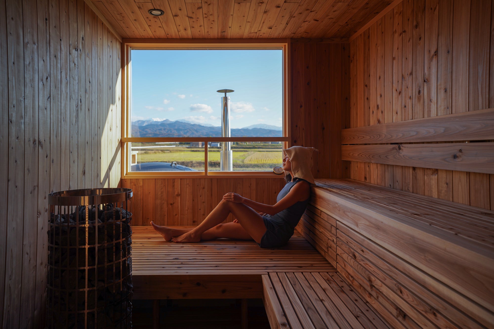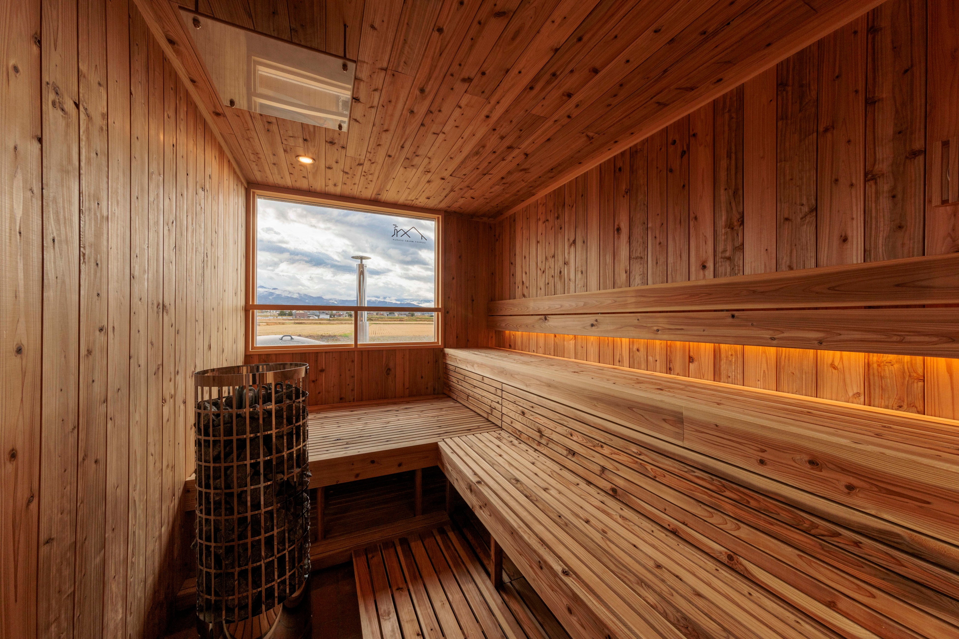 サウナ室は、フィンランド製のストーブによる中温でゆったりと長く入れるスタイル。大きな窓から刻一刻と変わる剱岳や田園風景をお楽しみいただけます。座るだけでなく、寝転んだり、姿勢を変えたり、朝や夜の気分に合わせて柔軟に過ごすことができます。