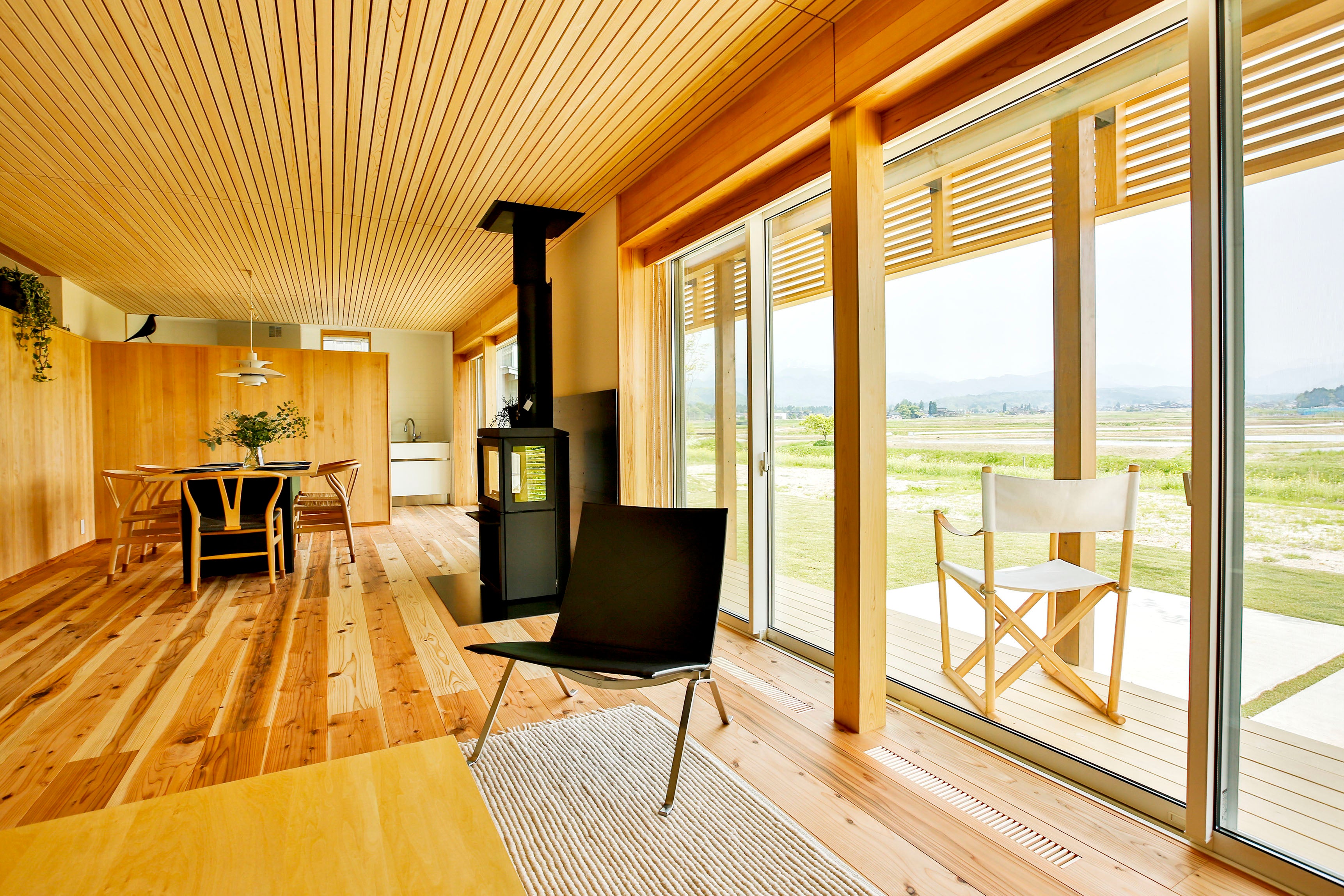 立山連峰・剱岳を臨む縁側、薪ストーブを備えたリビング、ダイニングキッチン、バス、トイレ、寝室を備えた150坪の2階建ての一軒家。伝統的な木造在来軸組工法を用い懐かしくも新しい居心地の良さを提供します。