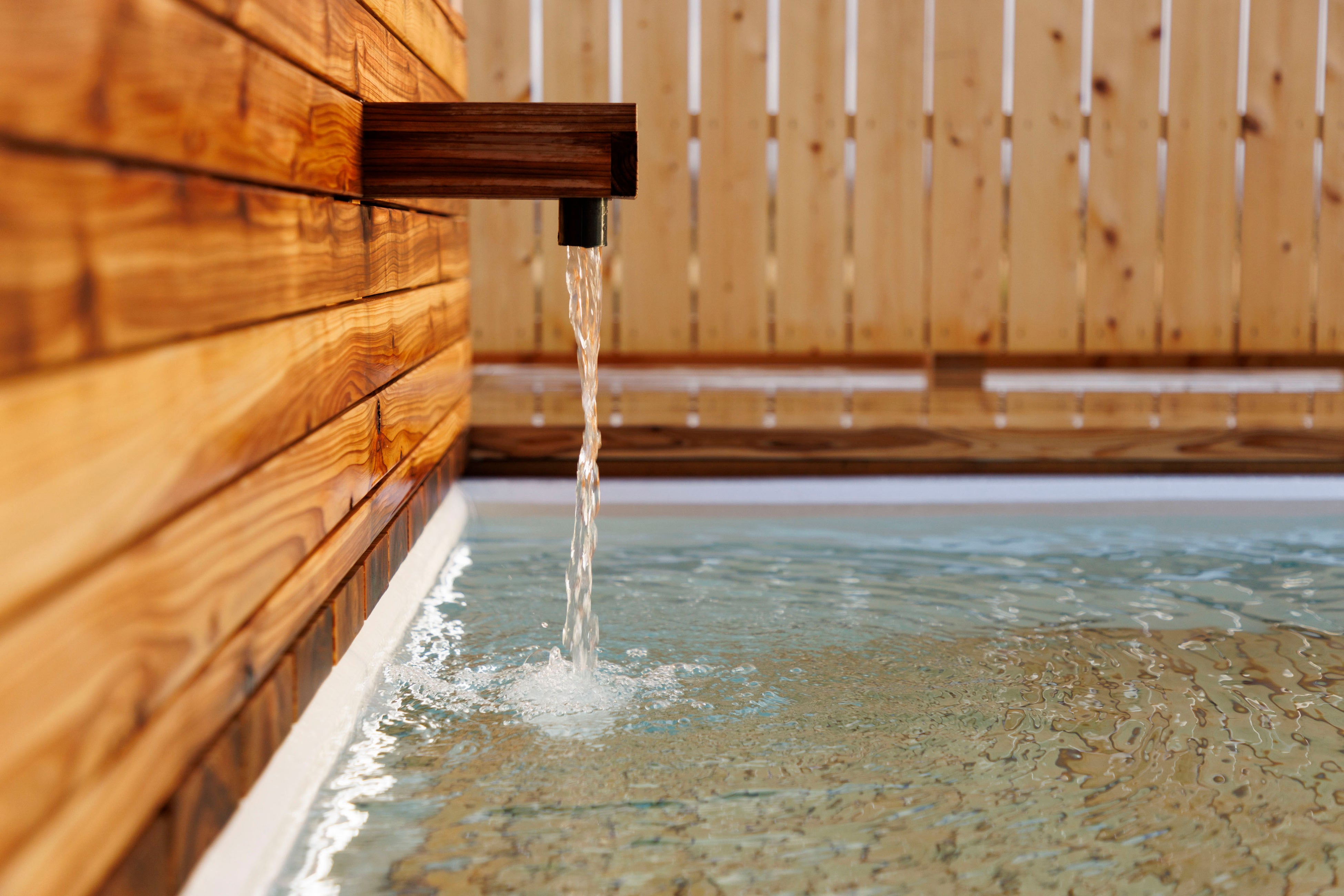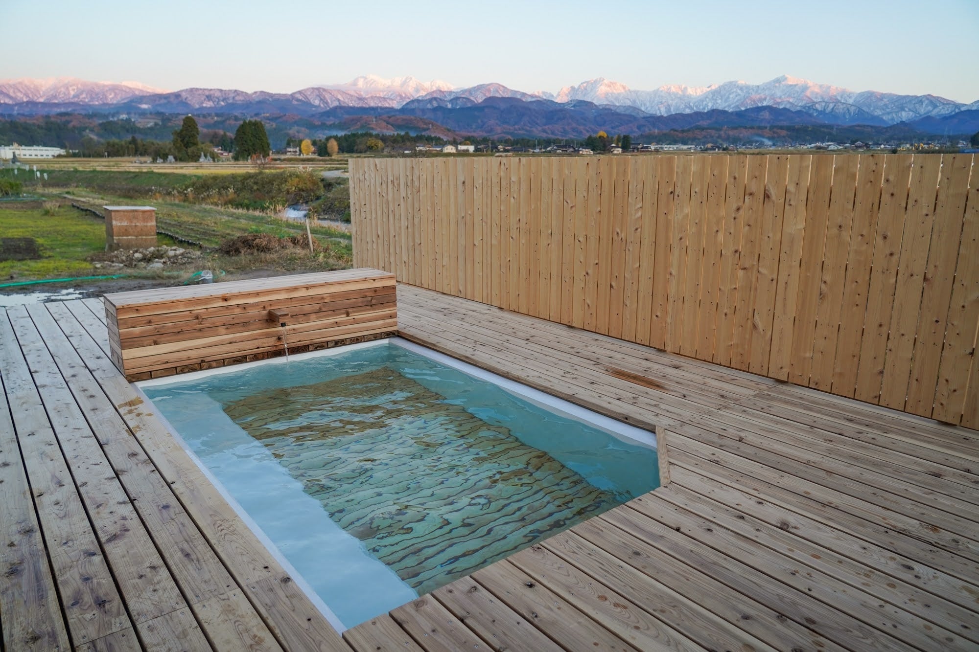 立山連峰の雪解け水の地下水を掛け流しで使用。肌になめらかな上質な水を体感いただけます。屋外で外の空気を感じながら、大人がゆったりと大の字で浸かれる広さです。夏は庭先のプールとしてお子様にもお楽しみいただけます。