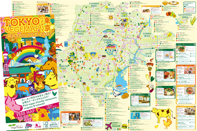 「東京ベジマップ」は、都内にあるベジタリアン・ヴィーガン対応の飲食店が一目でわかる紙媒体のマップです。東京都内の観光案内所やマップに掲載の飲食店などで、無料で入手することが出来ます。