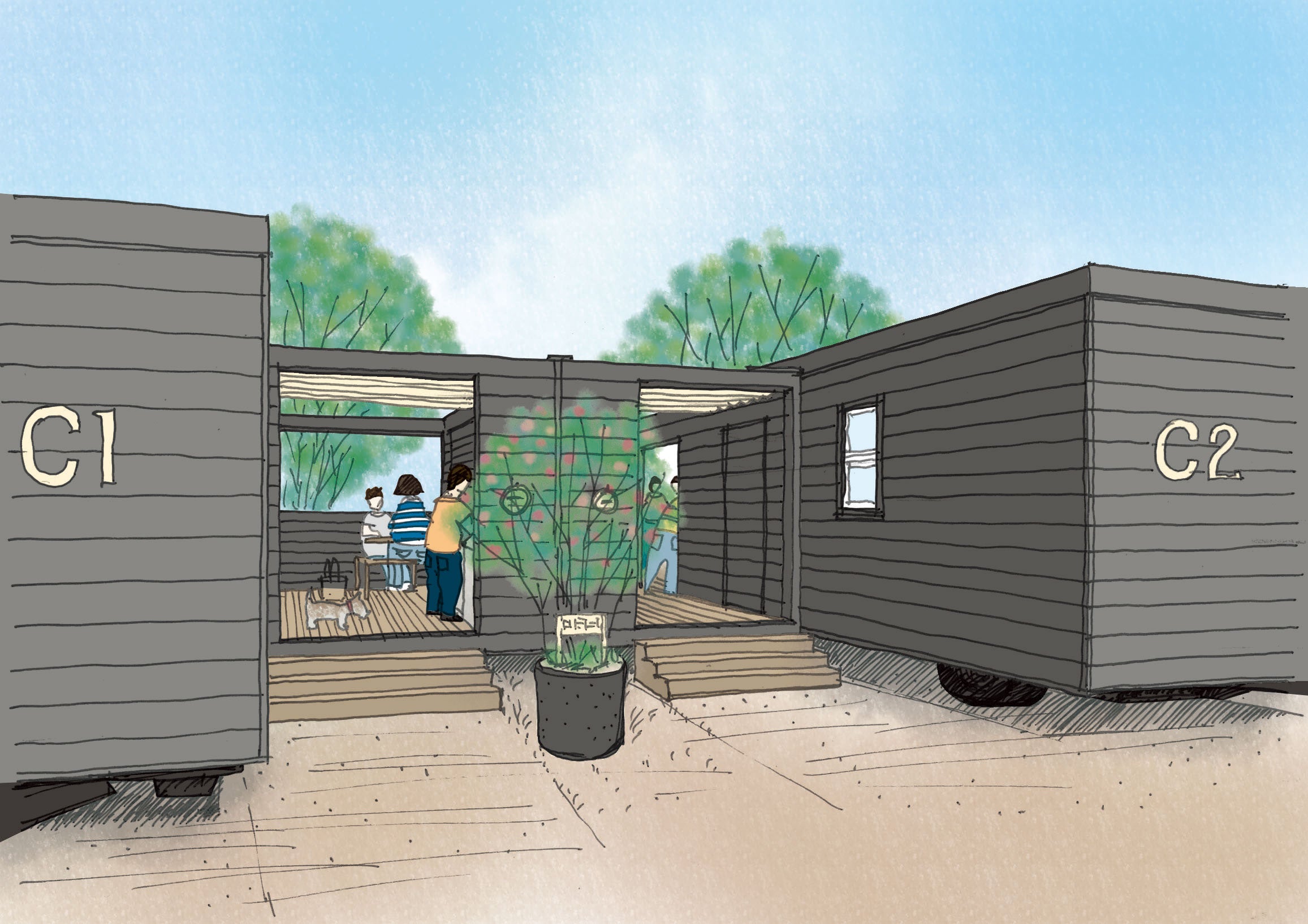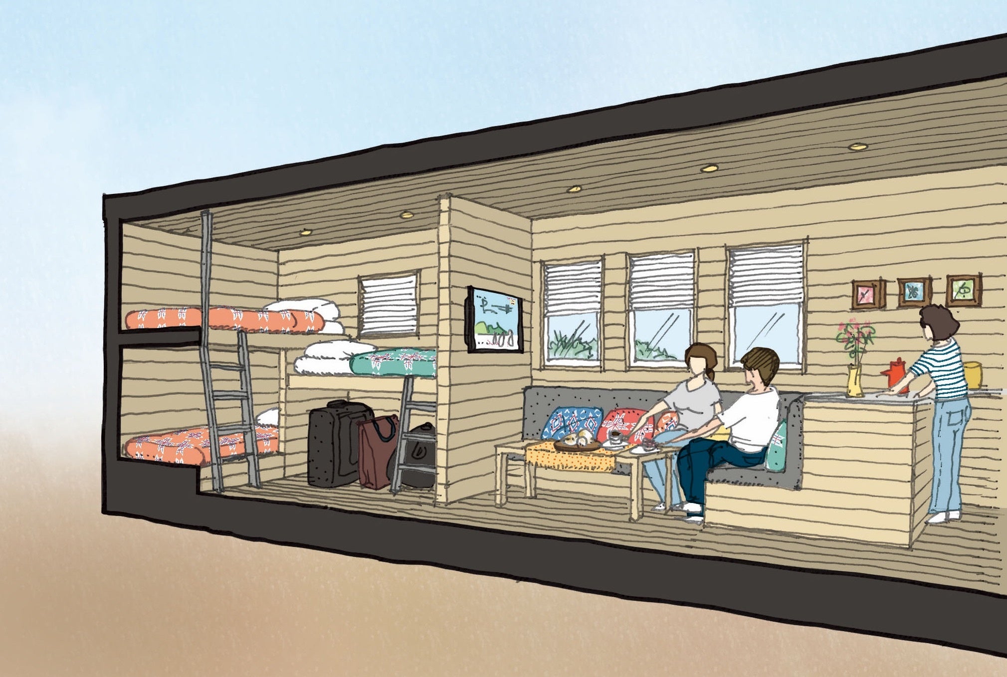 最大5名まで泊まれるトレーラータイプの宿泊施設。宿泊者はおふろcafe あげき温泉、サウナラウンジもセットでご利用いただけます。日常から少し離れて、自然に触れたり、いなべの商店街を散策したり、温泉・サウナを楽しんだりと、ゆっくりお過ごしください。