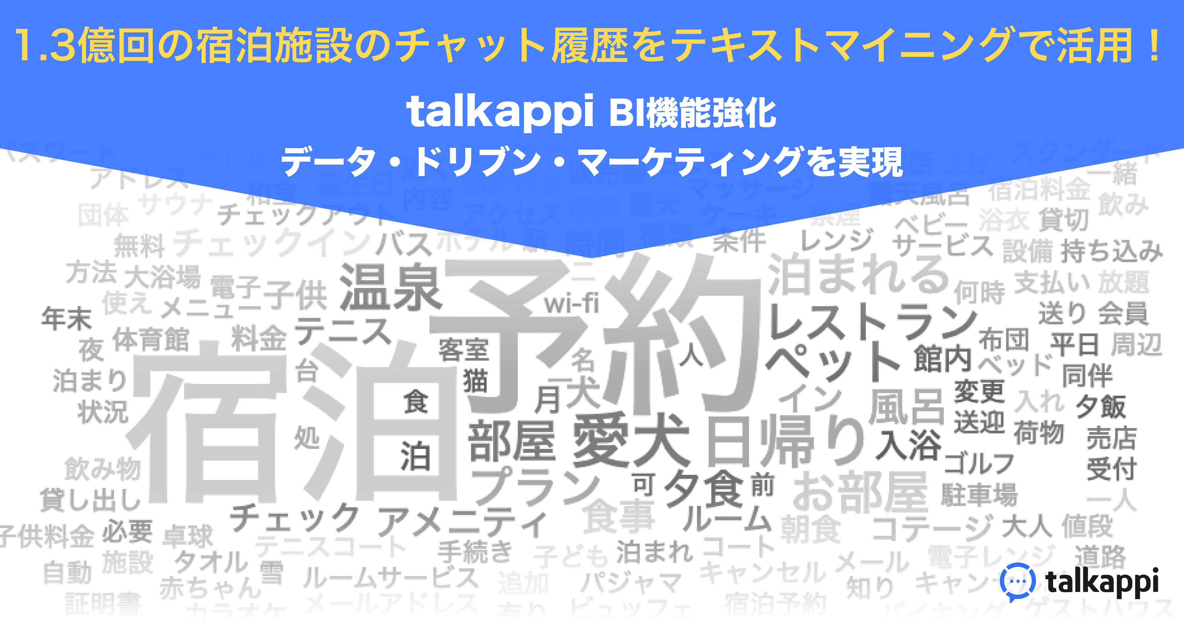 「talkappi」のチャットボットは、旅行前によく利用されます。予約前に部屋、宿泊プランの検討や、交通・アメニティ・付帯サービスの確認など、チャットの利用履歴にはお客様の旅行前の関心事が反映されます。「talkappi CHATBOT」が2017年からサービスを開始して以来、全ての導入施設で、既に延べ2千万人以上の方がチャットボットを1.3億回以上利用されました。蓄積されたチャット利用履歴は観光分野に特化した貴重なお問い合わせの応答データで、導入施設様にご活用いただきたく、今回のテキストマイニング機能の提供に至りました。