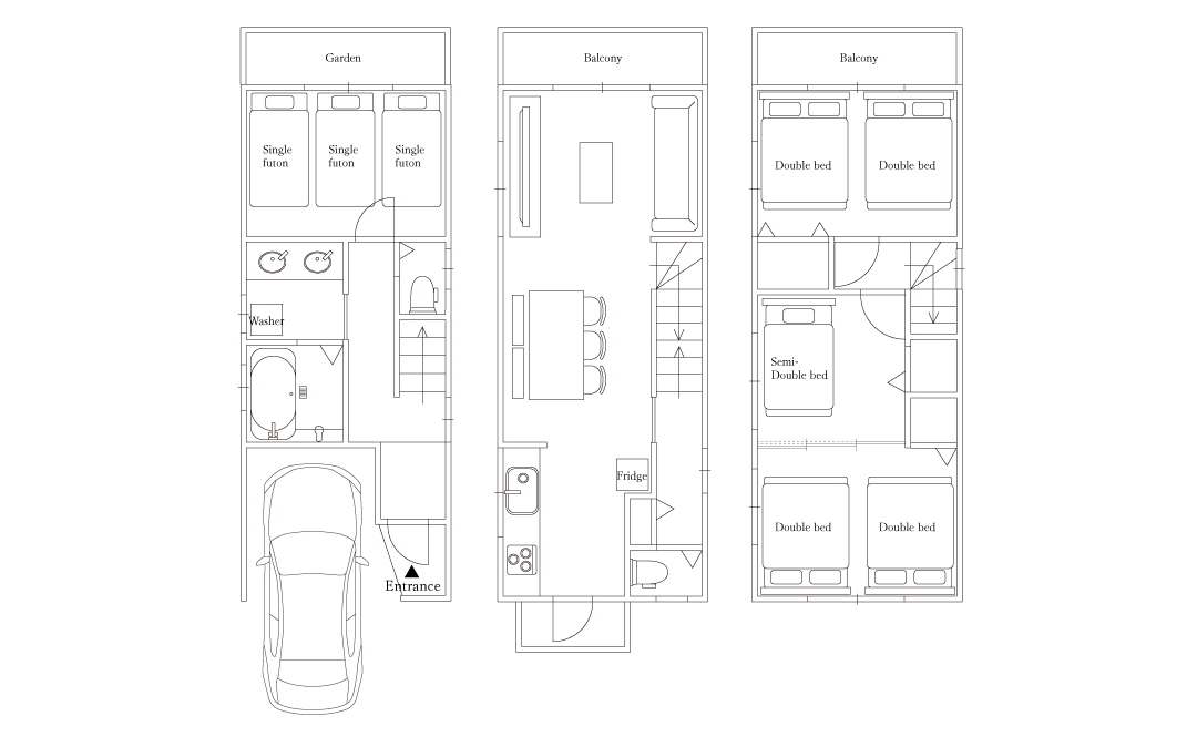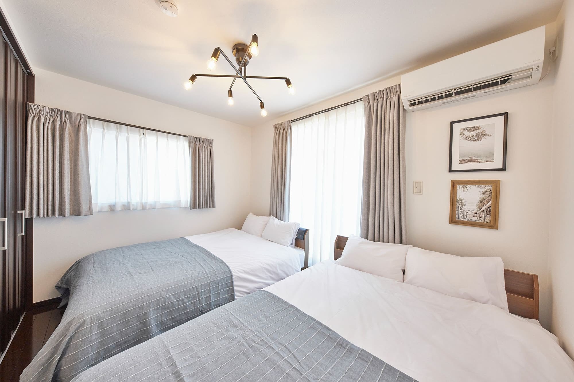 1階和室はシングルサイズの布団が3組。3階寝室には、ダブルベッド4台、セミダブルベッド1台。2階リビングエリアにあるソファは、ソファベッド(ダブル)と使用できます。