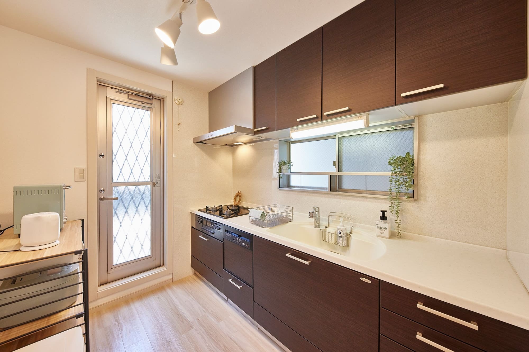 ガスタイプの3口コンロを備えた広いキッチンには、鍋やフライパン、包丁などの調理器具に加えて、電子レンジや電気ケトルなどのキッチン家電を豊富に取り揃えています。また、食器類やカトラリー(箸やフォークなど)も人数分用意しています。