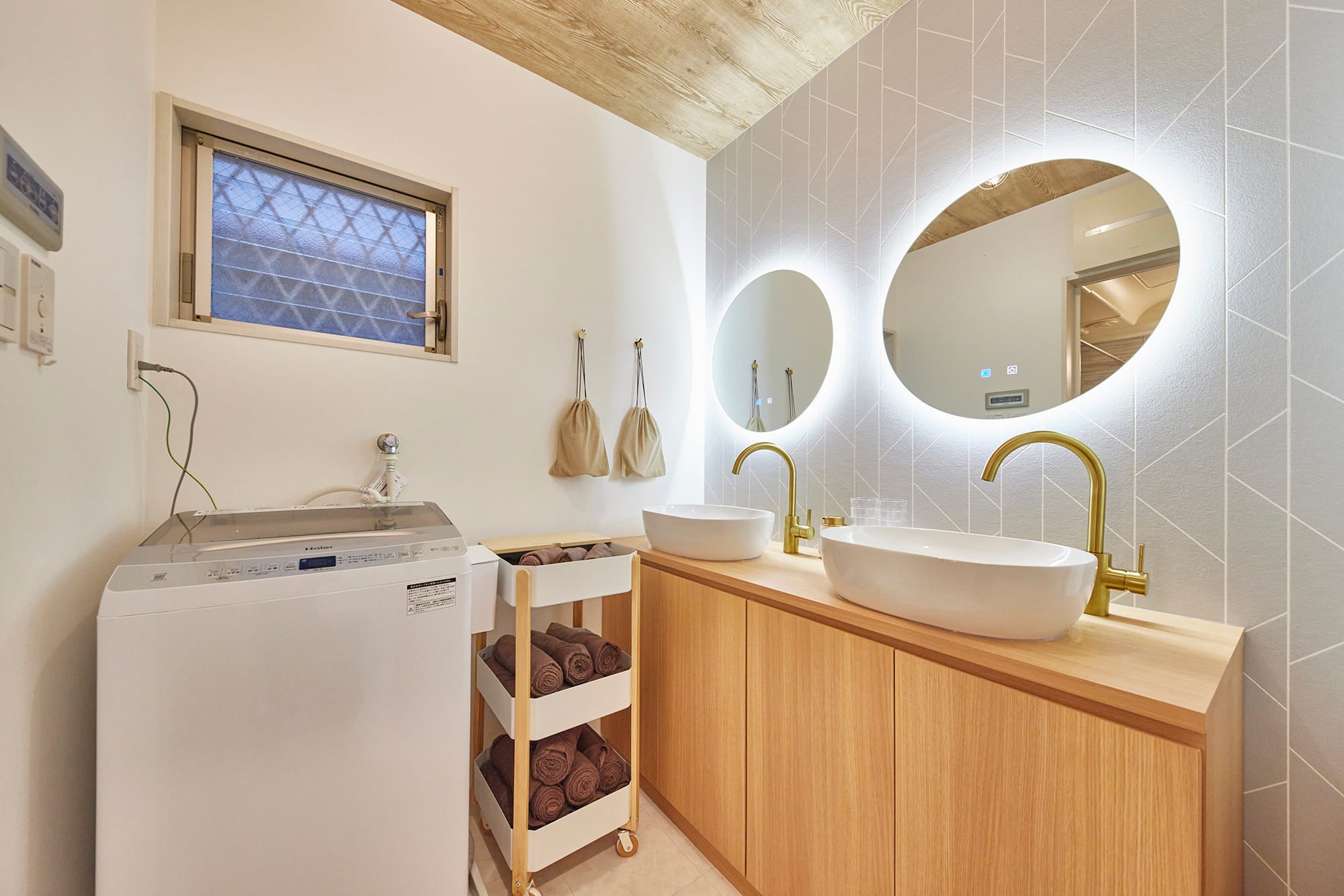 洗面化粧台は2つあるので、お出かけ前に順番を気にせずにお使い頂けます。バスルームには、洗濯機があるためご滞在中はいつでもご利用可能です。