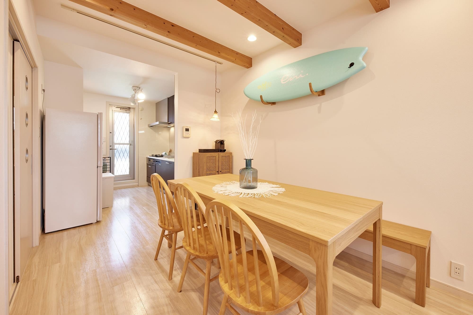 建物の2階は、キッチンが併設された広々としたリビングダイニングルームです。大きなソファのあるリビングでは、クロームキャスト付きの大型液晶テレビで旅の思い出をみんなで楽しむこともできます。ソファはダブルサイズのベッドとしてもご利用頂けます。