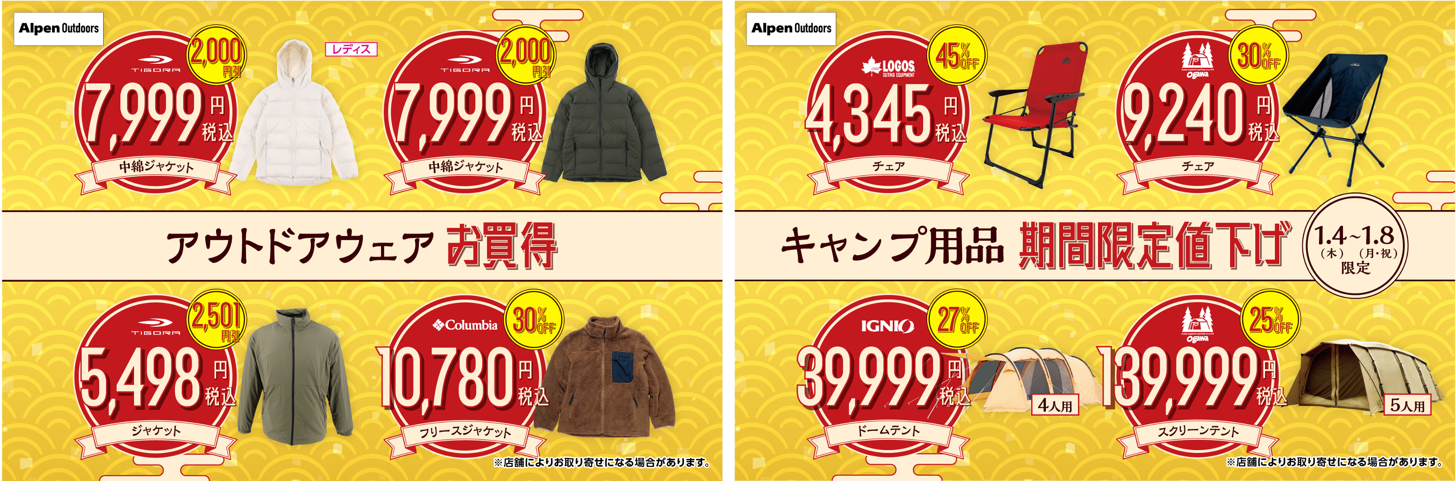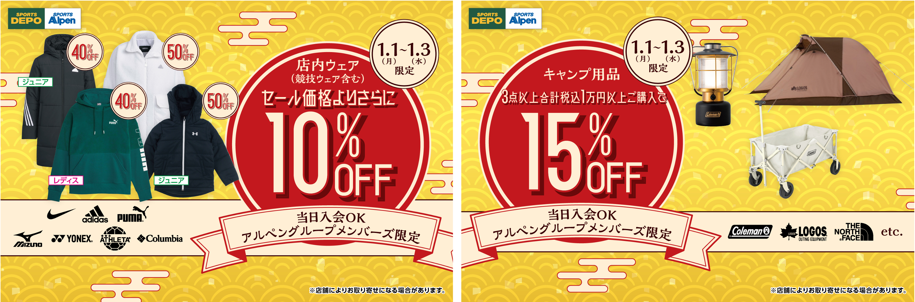 ※ウェア割引企画、キャンプ用品割引企画は、当日入会可能なアルペングループメンバー限定企画となります。