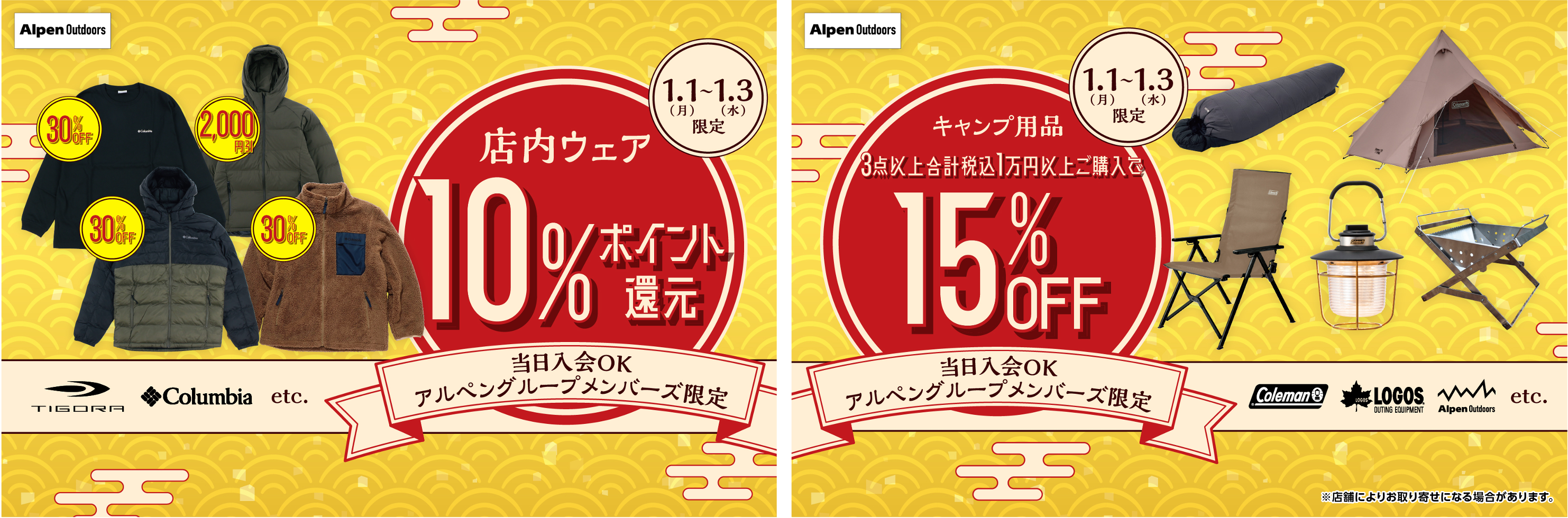 ※ウェアポイント還元、キャンプ用品割引企画は、当日入会可能なアルペングループメンバー限定企画となります。