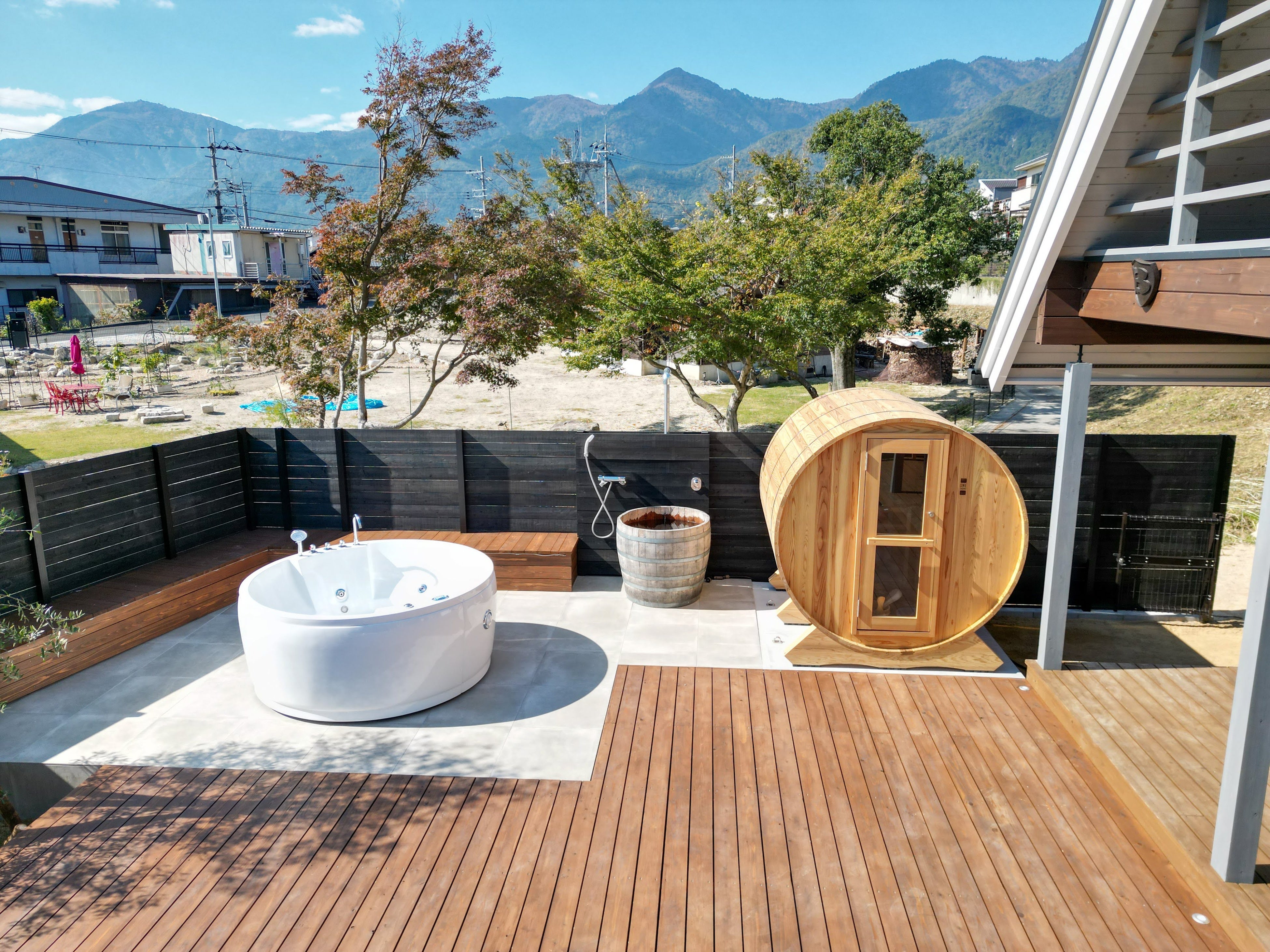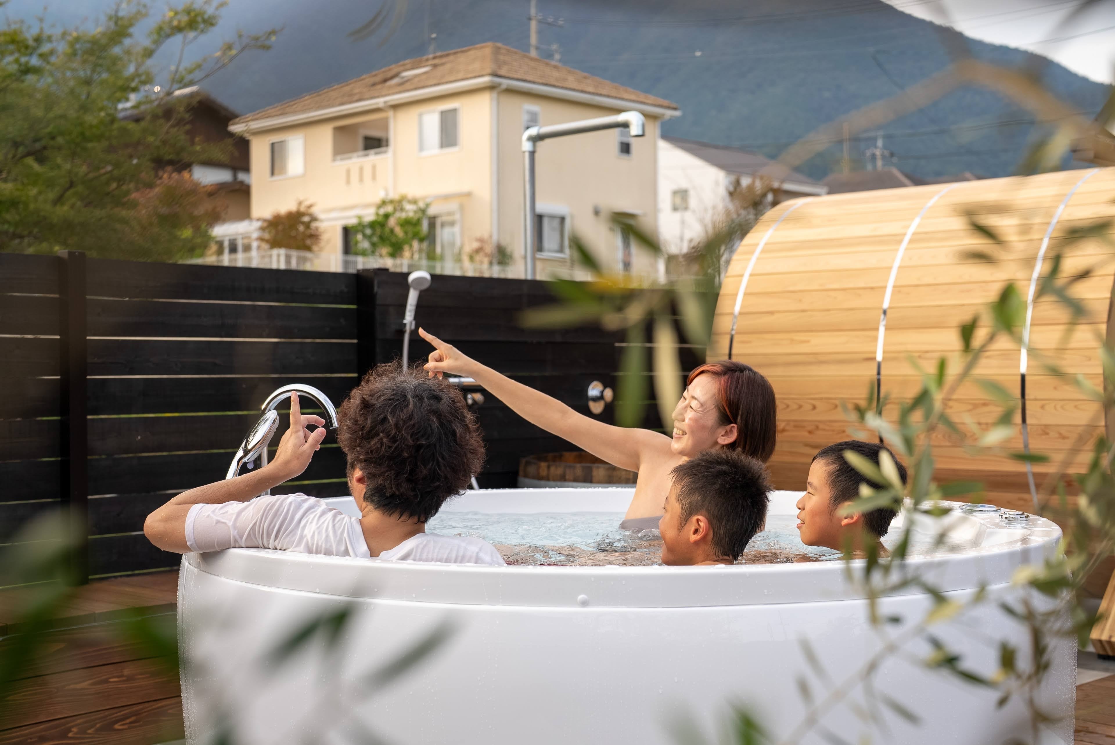 4~6人用の巨大ジャグジーが備え付けられており、屋外でのリラックスを体験できます。開放感あふれる空間で、サウナを楽しみながらくつろげます。