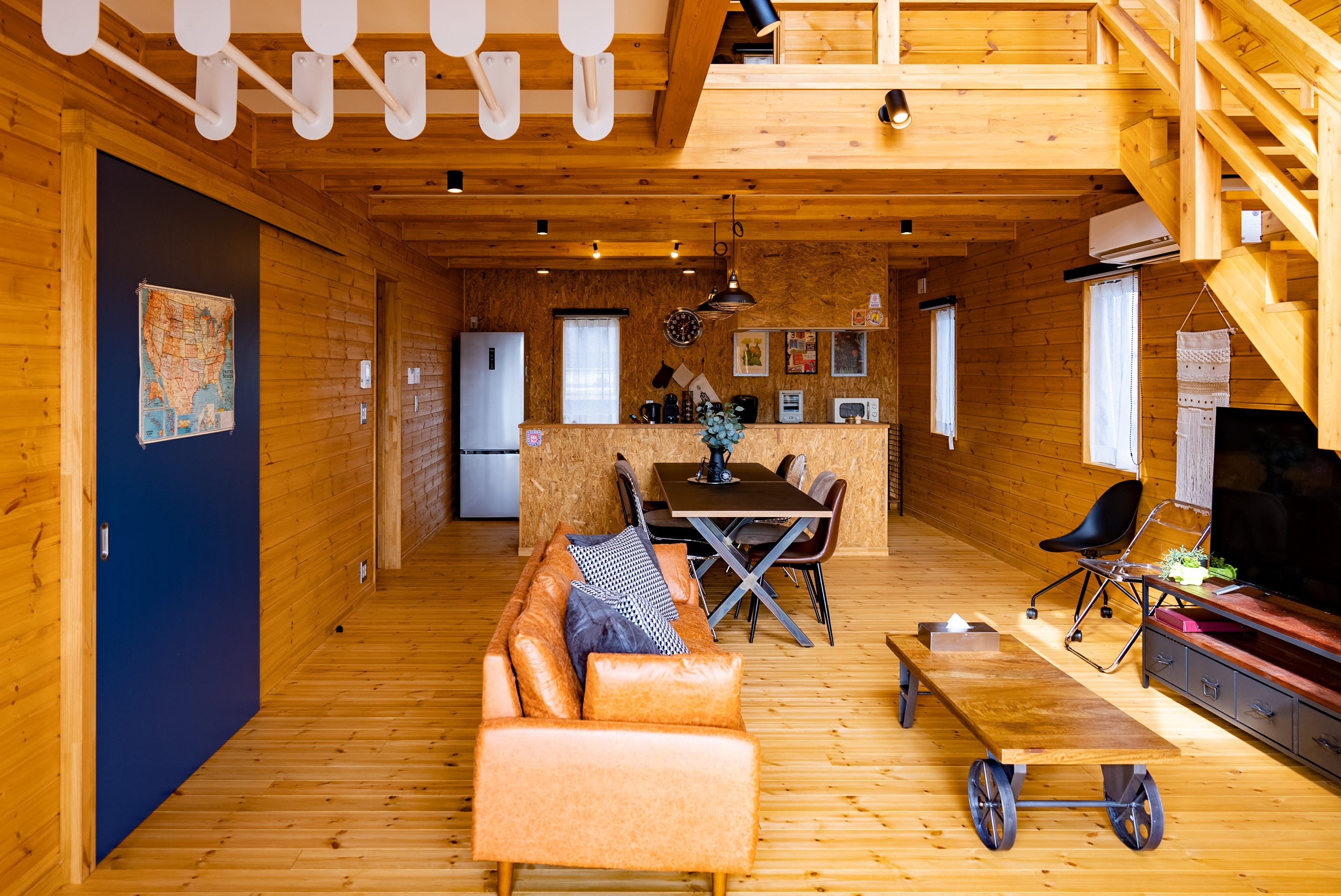 サウナカー(薪サウナ)付きの波棟。1階には9人が座れるダイニングテーブルとリビングスペース、2階には小あがり畳の広々リビングがあり、ご友人と夜中まで語りあったり、ご家族でゆるやかな時間を過ごしたり、趣味や仕事に打ち込んだり、思い思いの過ごし方をお楽しみいただけます。namiでは最大9名様が宿泊可能となっております。