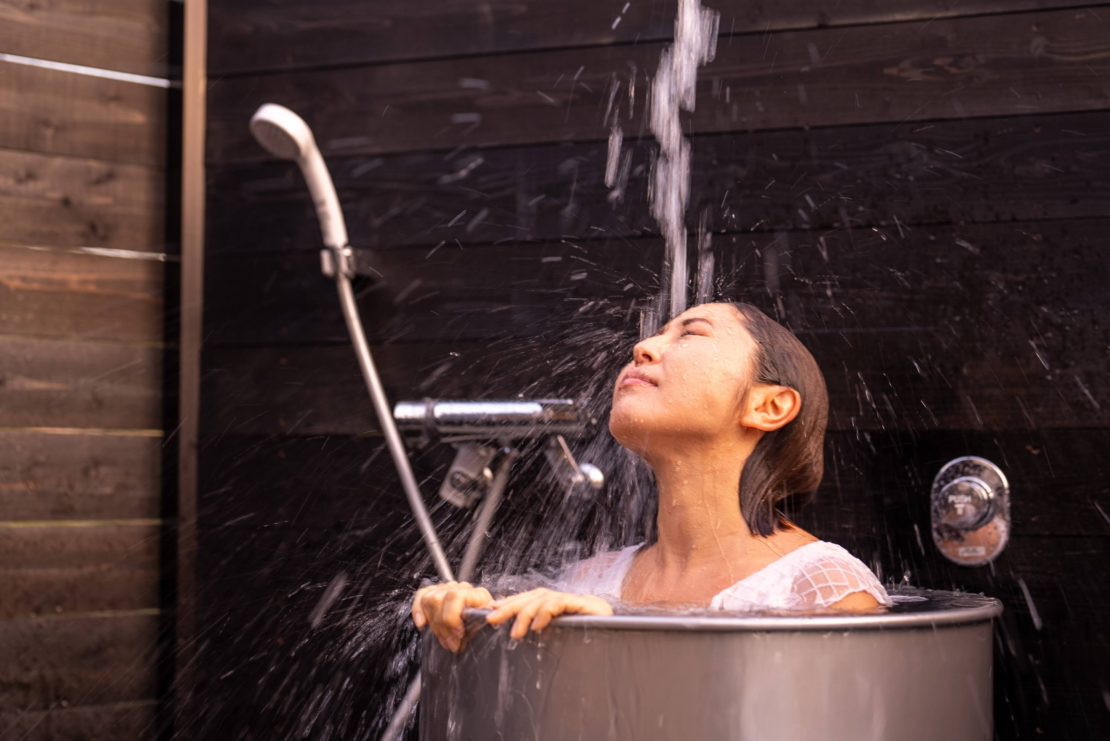 ウイスキー樽を利用した水風呂が施設内にあり、新鮮な体験を楽しむことができます。頭上から降り注ぐ滝行も楽しめ、リフレッシュ効果を提供します。