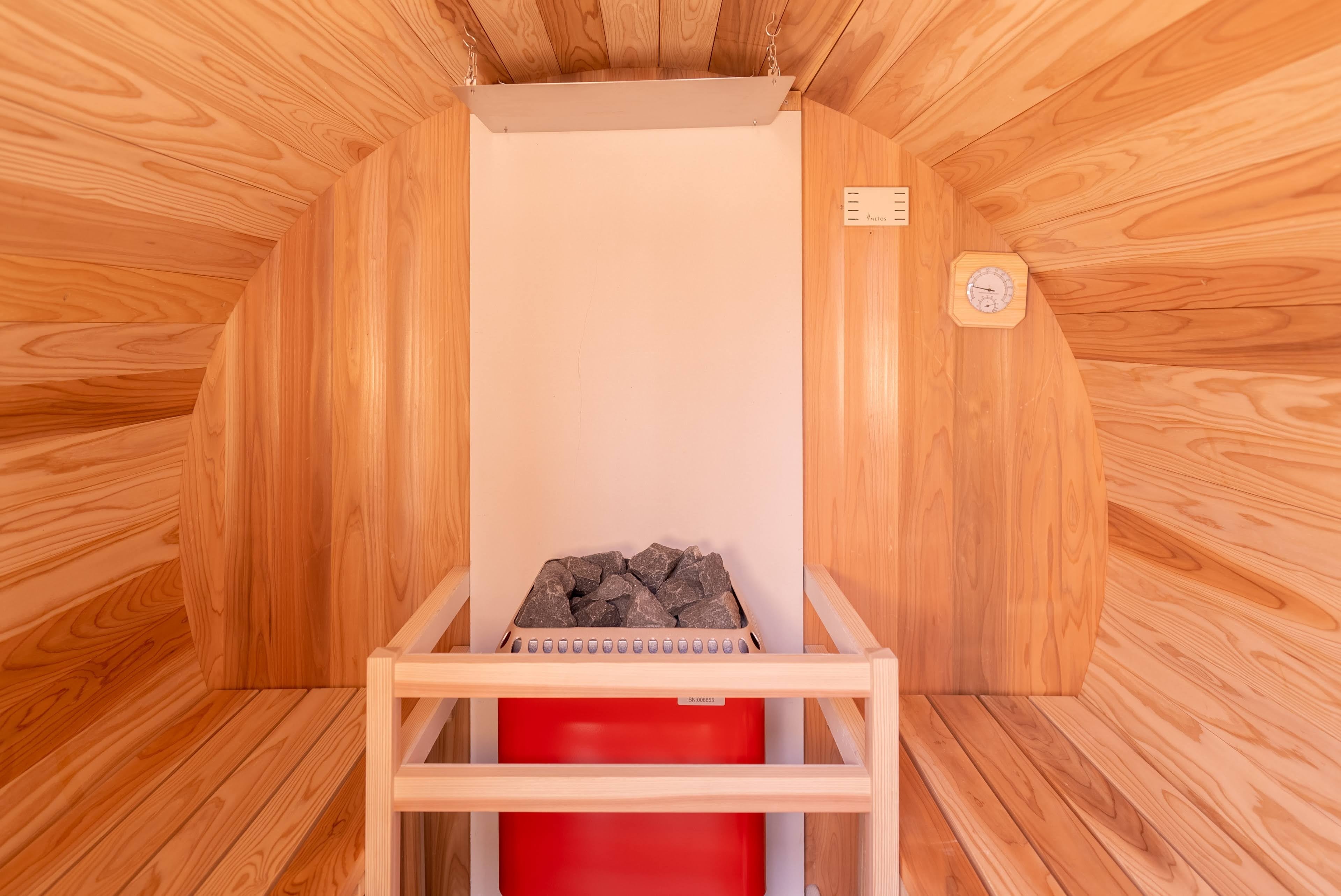 バレルサウナが設置されており、独特のデザインと共に、贅沢なサウナ体験を提供しています。円筒の形をしているので、熱の周りがよく均等に伝えられるのが特徴で、木のぬくもりと香りに癒やされながらお楽しみいただけます。