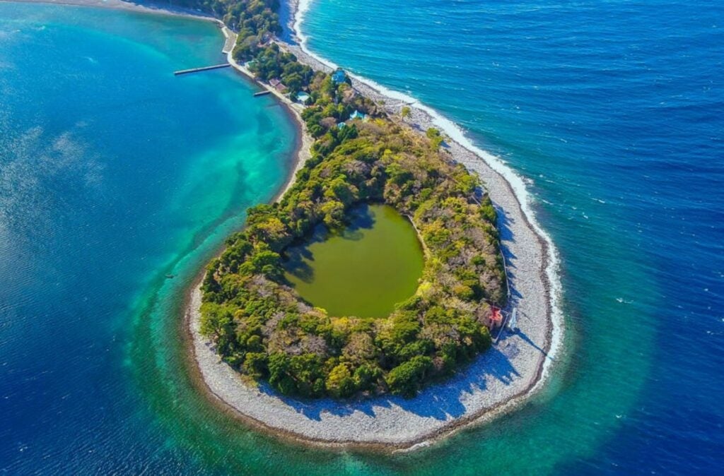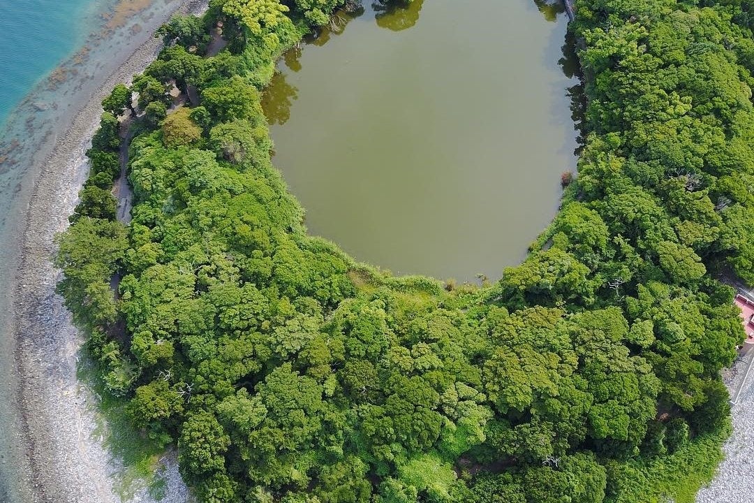 「神池」は海側にありながら淡水池の別名「琵琶島(びわじま)」と呼ばれる大瀬神社境内に存在します。最長部の直径が約100mの池で、海から最も近いところでは距離が15m。海水が吹き込む立地でありながら淡水池で鯉やフナ、ナマズなどの淡水魚が多数生息しているパワースポットです。