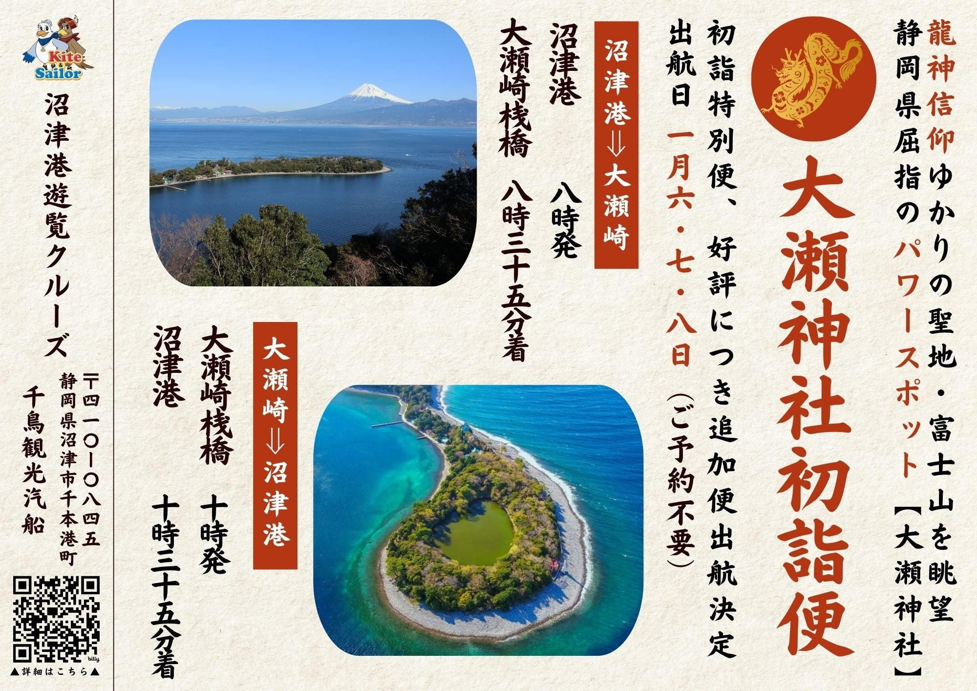2024年初詣!クルーズ船で楽々♪沼津港⇔大瀬(おせ)崎往復クルーズ船が出航!大瀬崎の「神池」など”回龍元祖”の地を巡り、龍神パワースポットの大瀬神社で辰年の開運祈願をご提案いたします。