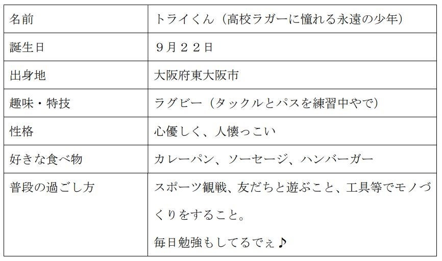 東大阪市は1991年3月に「ラグビーのまち」を表明し、ラグビーのイメージを活かしたまちづくりを推進してきました。そのマスコットキャラクターとして翌1992年に誕生し、「ラグビーのまち」「モノづくりのまち」東大阪市をアピールし続けています。