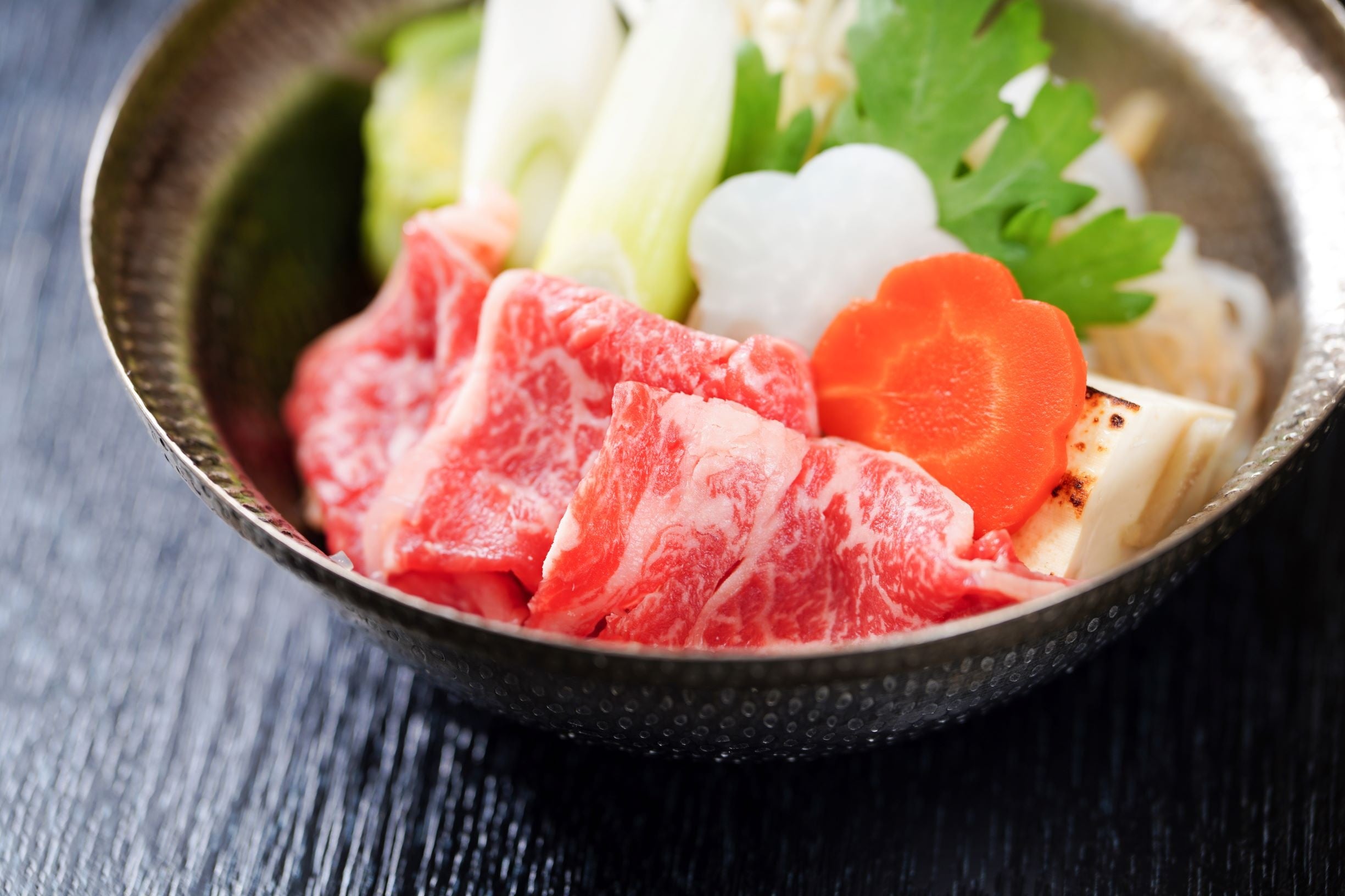 メインの「ズワイ蟹」は半身をボイルで、「牛すき鍋」は、国産牛リブロースを使用しており、なめらかな泡玉子とともにお召し上がりいただきます。水菜を巻いた「鰤」は、昆布出汁にさっとくぐらせて、ポン酢とゴマだれからお好みでどうぞ。その他、島根県産の穴子をサクっとふわふわに揚げた「穴子と白ネギの天ぷら」、野菜やきのこたっぷり味噌味の「サーモンホイル焼き」、トリュフ風味のドレッシングと赤ワインを合わせて、温度玉子にかけた「温玉のトリュフ風味 赤ワインソース」などと、スイーツは、ルビーショコラのクリームを使用したショートケーキ「ルビーショコラのトルテ」、ホワイトチョコレート入りクリームと抹茶シロップが相性抜群の「抹茶のオペラ」などをご用意いたします。