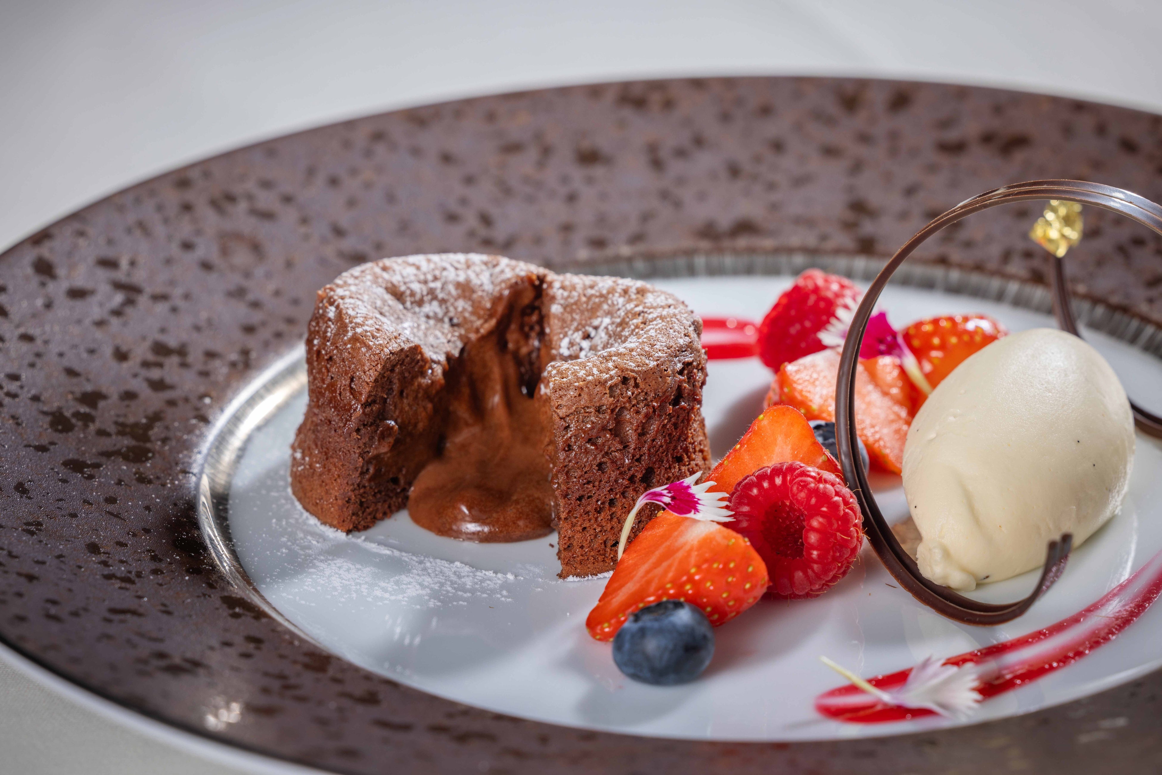 フランス料理「ミクニナゴヤ」のディナーコースのデザートに、あったかトロリとチョコレートソースがこぼれるフォンダンショコラが登場。
