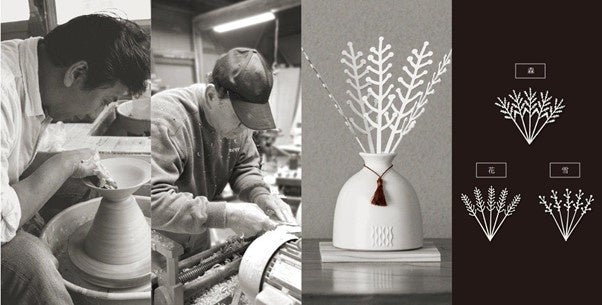 容器は、徳利をモチーフにした磁器で、有田の有名な窯元「李荘窯」で作陶されています。そして、容器の底はアロマオイルの残量が少なくなってもアロマを充分に吸い上げられるような上げ底構造にしています。コースターには、日本固有種である杉を採用しており、吉野杉の香りが「和の香」の香りを更に引き立てます。正絹のタッセルは京都の工芸職人が染め上げ、手編みした製品で、一月に100本しか作れない逸品です。また、四季の草木を表現したリードスティックは日本製の特殊な厚紙を型抜きしたオリジナルデザインであり、つぼみが膨らんだ桜の小枝、緑したたる針葉樹の葉、雪化粧した冬枯れの枝の3種類のデザインを用意しています。オリジナルデザインを施した特殊な厚紙で、アロマオイルを効率よく吸い上げ、香りを広範囲に拡散させます。