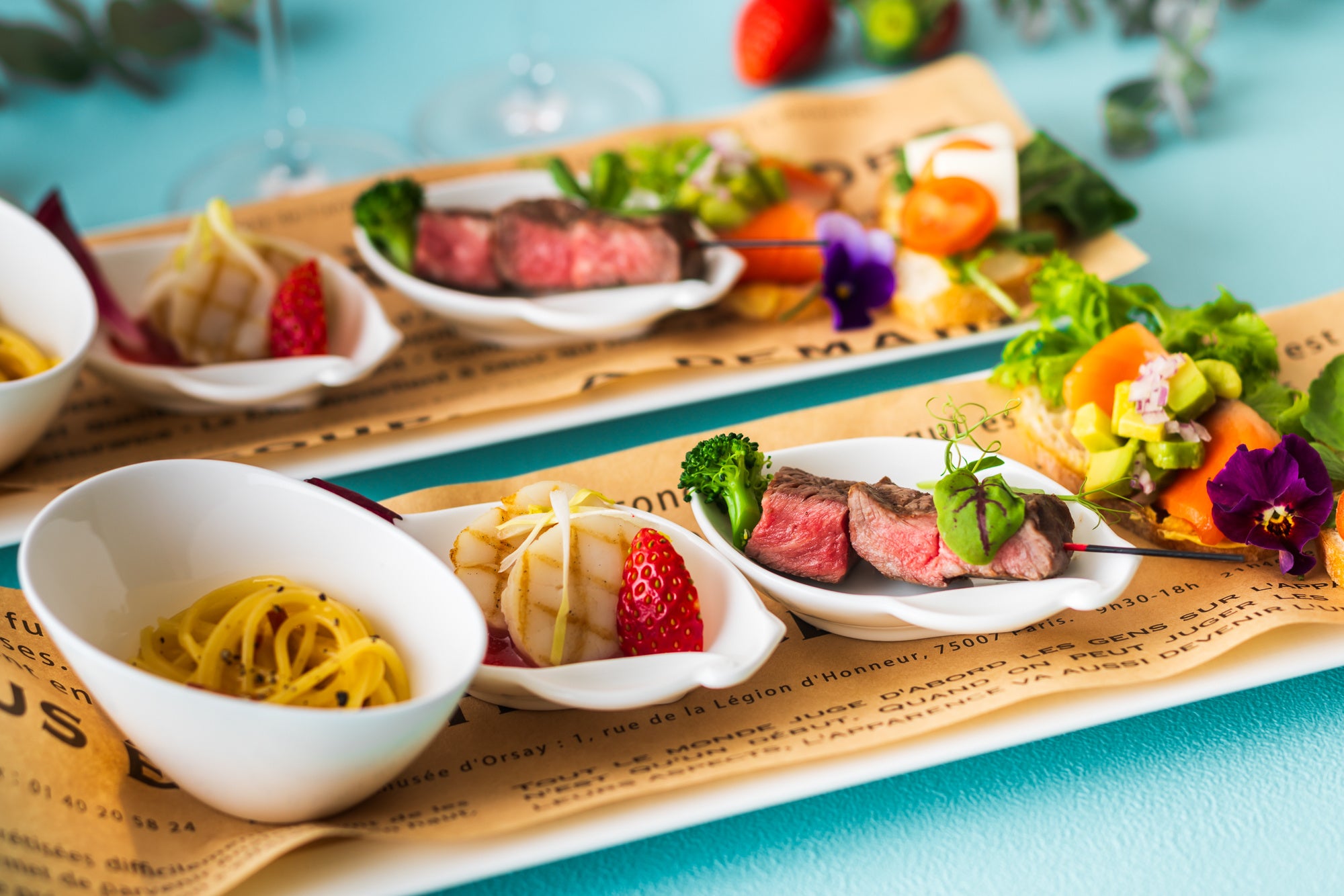 牛サーロイン肉のソテー バルサミコソース・パスタカルボナーラ風・ホタテ貝のグリルとイチゴのセビーチェ アンディーブ添え・ブルスケッタ2種(ベーコン、モッツァレラチーズ、トマト、ルッコラ/スモークサーモン、アボカド、オニオン)