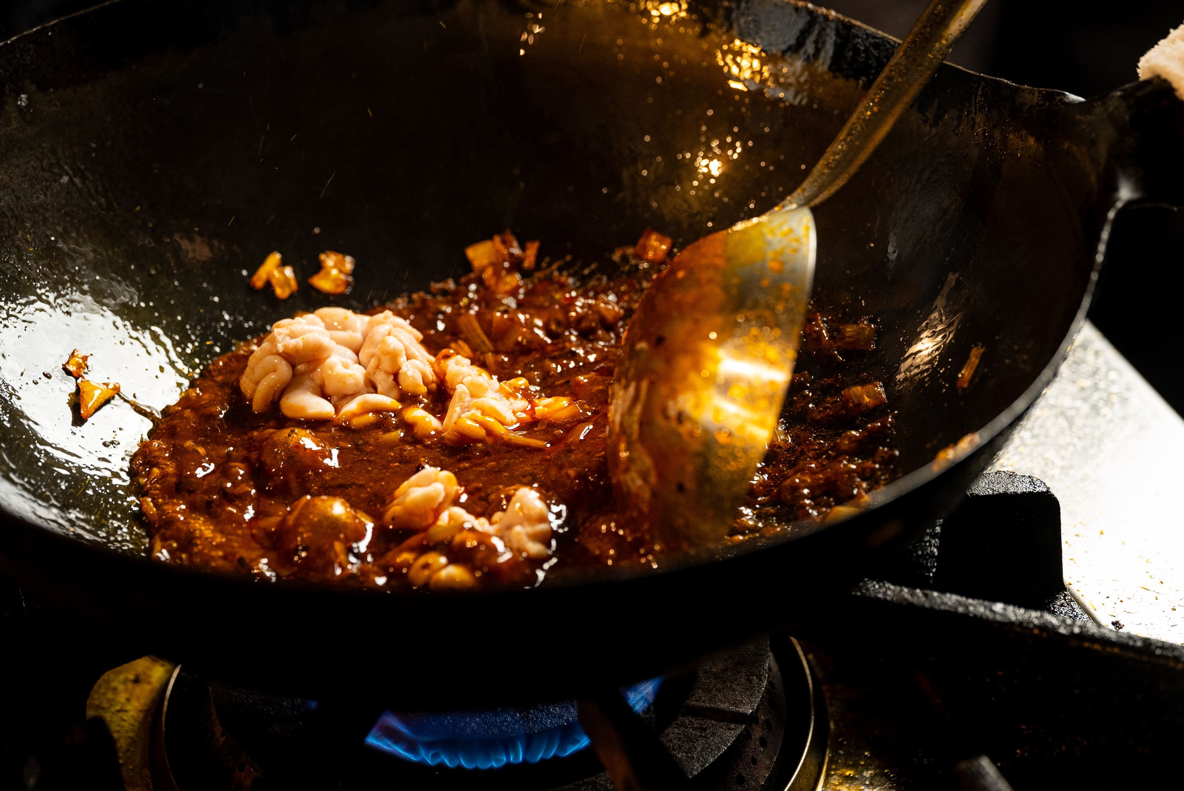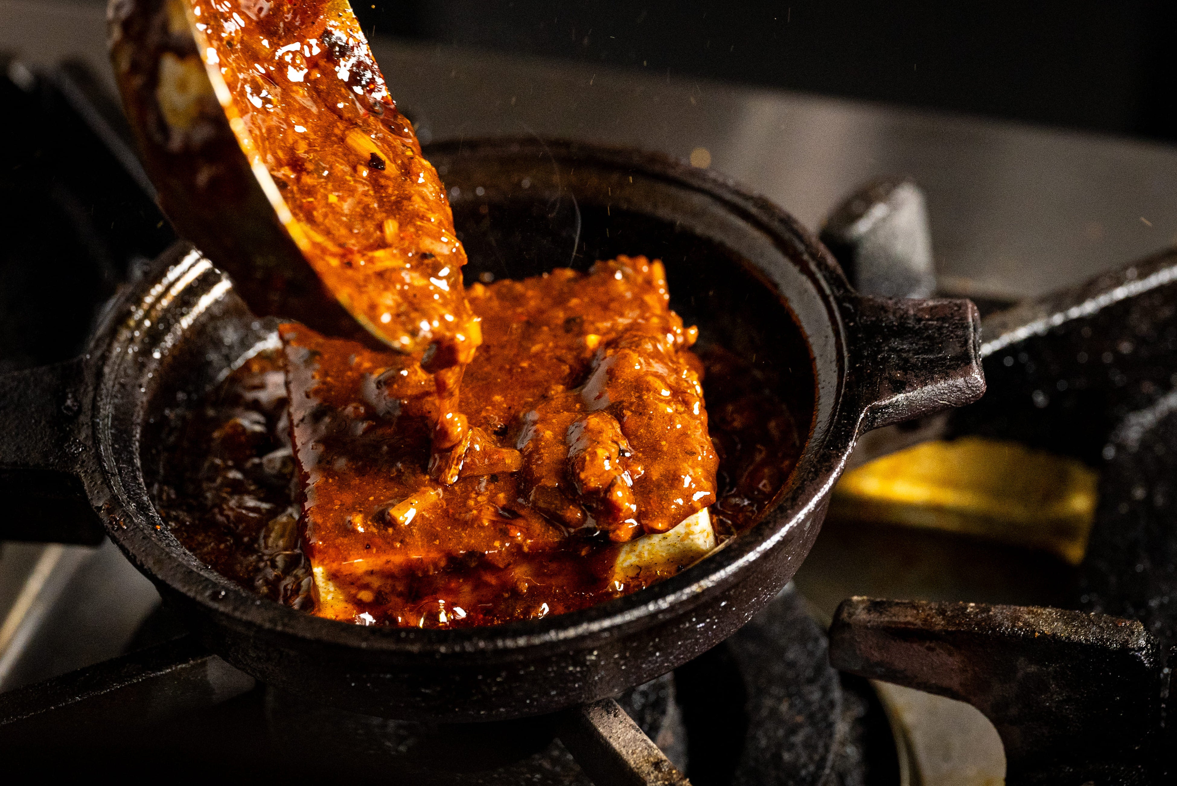 一丁の京豆腐とこだわりの麻婆を鉄鍋で加熱することで、豆腐全体に均等に火が通りムラなく調理が行われます。
