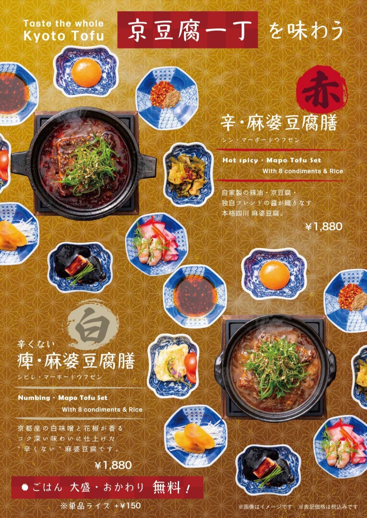 京都の歴史と伝統を感じさせる京豆腐一丁を使った麻婆豆腐は、地元の食材を活かした地域性と新しい味わいの発見で、特別な食体験をお届けいたします。