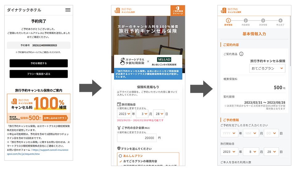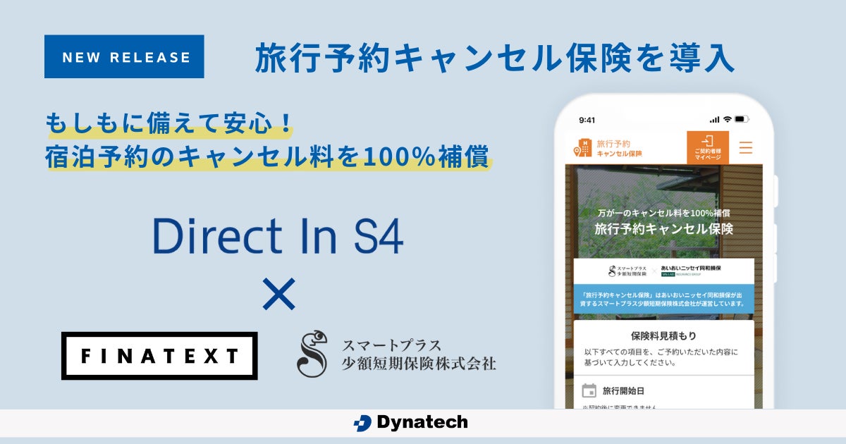 ダイナテック株式会社(本社:東京都千代田区、代表取締役社長:安房正浩)は、 2023年12月20日(水)に、宿泊予約システム「Direct In S4(ダイレクトインエスフォー、以下S4) 」において、株式会社Finatext(本社:東京都千代田区、代表取締役CEO:木下 あかね、以下「Finatext」)とスマートプラス少額短期保険株式会社(本社:東京都千代田区、代表取締役:小山 宏人、以下「スマートプラスSSI」)が提供するサービス組込型の「旅行予約キャンセル保険」を導入いたしました。
