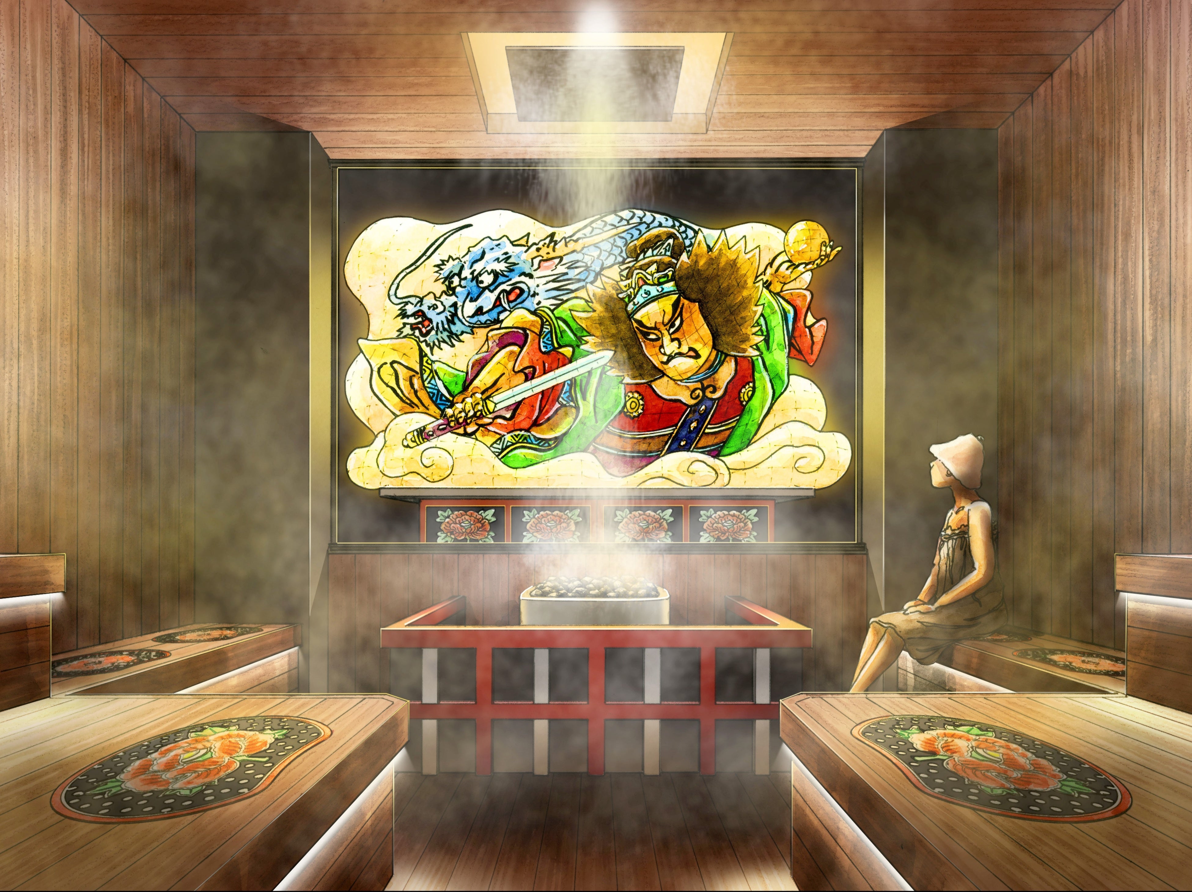 サウナ室の扉を開けると、正面に設えられたねぶたが出迎えます。ねぶたは第7代ねぶた名人の竹浪比呂央氏が主宰する「竹浪比呂央ねぶた研究所」に制作いただきます。題材である「龍神」は、水や雨を司る神として知られ、青森ねぶた祭でもよく用いられる題材の1つです。また、サウナヒーターの囲いは、青森ねぶた祭の山車の曳き手が握る持ち手をイメージした紅白のデザインで、ねぶたが目の前に迫る様子を表現しています。サウナに入りながら間近にねぶたの迫力ある造形を眺めることができる唯一無二の空間で、まるで祭りさながらの熱気を感じ、ととのうことができます。