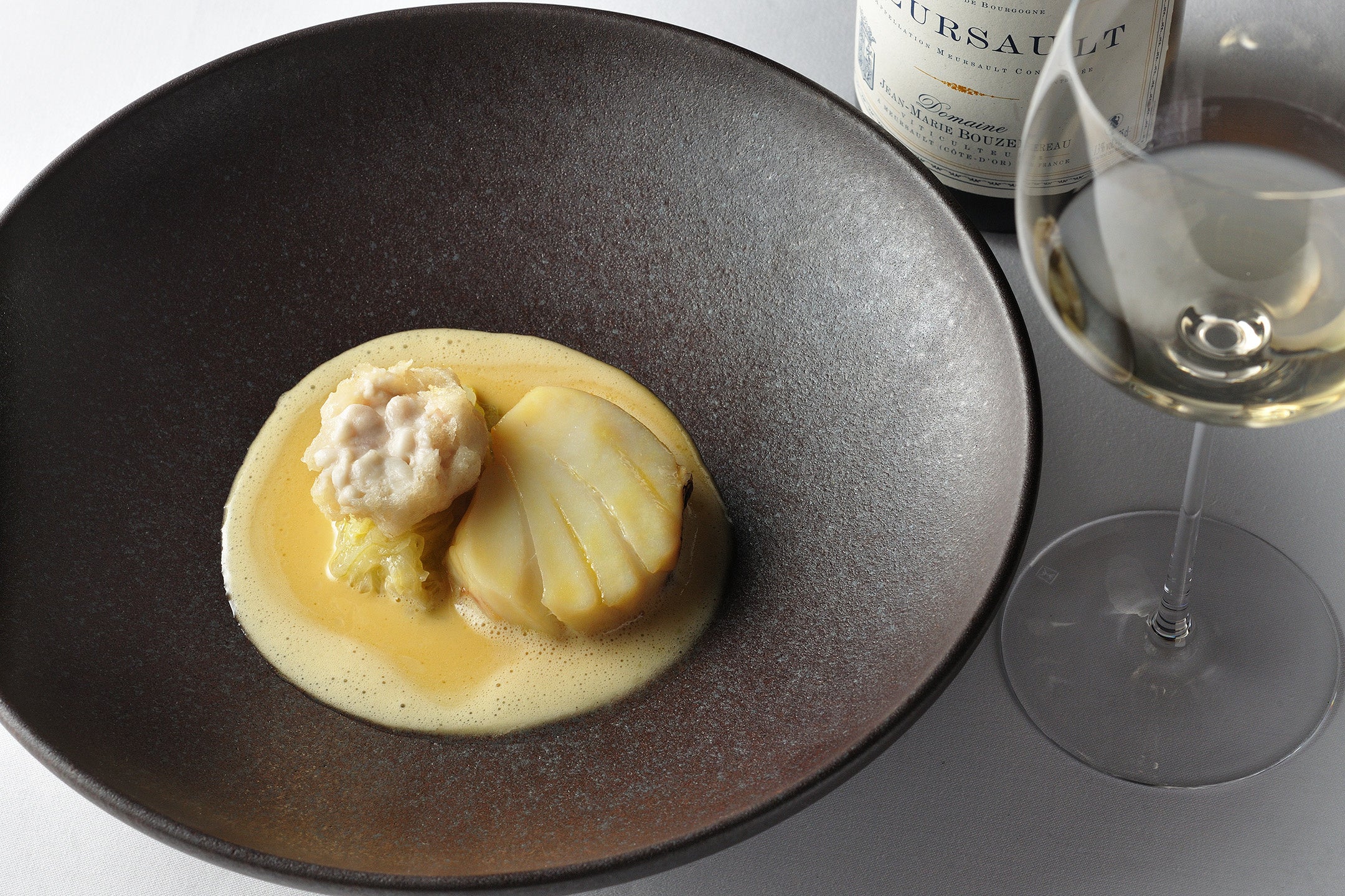 白子のクリーミーでコクのある味わいをさらに引き立てるために、バターのように濃厚でコクのある味わいが特徴の白ワインをセレクトしました。とても長い時間余韻を楽しめることが特徴的で、ミネラル感が強いシャルドネを使用しており、口当たりが良く、魚介の濃厚な旨味を堪能できる組み合わせです。