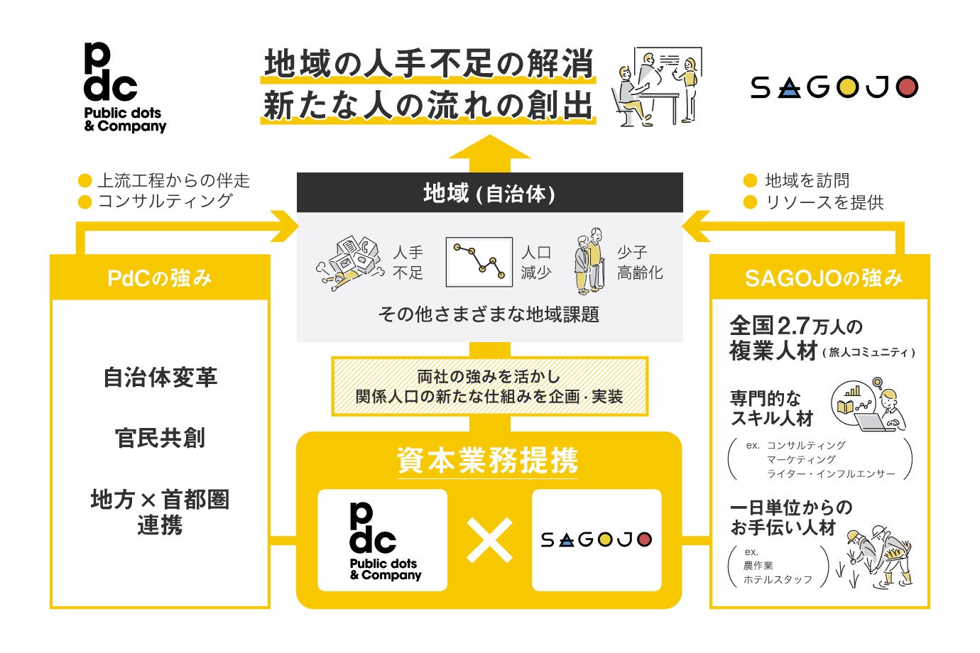全国の地域事業者と旅や地域貢献に関心の高いユーザーをマッチングするプラットフォーム「SAGOJO(サゴジョー)」を運営する株式会社SAGOJO(本社:東京都 足立区、代表取締役:新拓也、以下「SAGOJO社」)は、株式会社Public dots & Company(本社:東京都渋谷区、代表取締役:山口勉、以下「PdC社」)と業務提携及び資本提携を行ったことをご報告いたします。