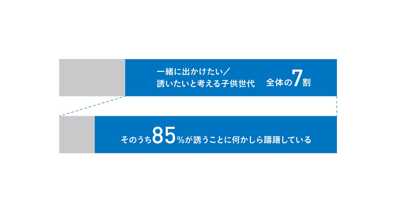 WHILL社が実施した調査結果(注2)によると、身体的な衰えを感じている、感じ始めている65歳以上(以下「シニア世代」)の2人に1人が行きたい場所があっても何かしらその気持ちを抑えていると回答しました。高齢の親と出かけたいと考える35~64歳(以下「子ども世代」)も7割に上りますが、うち85%は誘うことを躊躇っている(グラフ1)との実態がわかっています。両世代ともに、家族に気を遣ってしまったり、足腰や体力を心配したりすることが二の足を踏む主要な理由となっています。