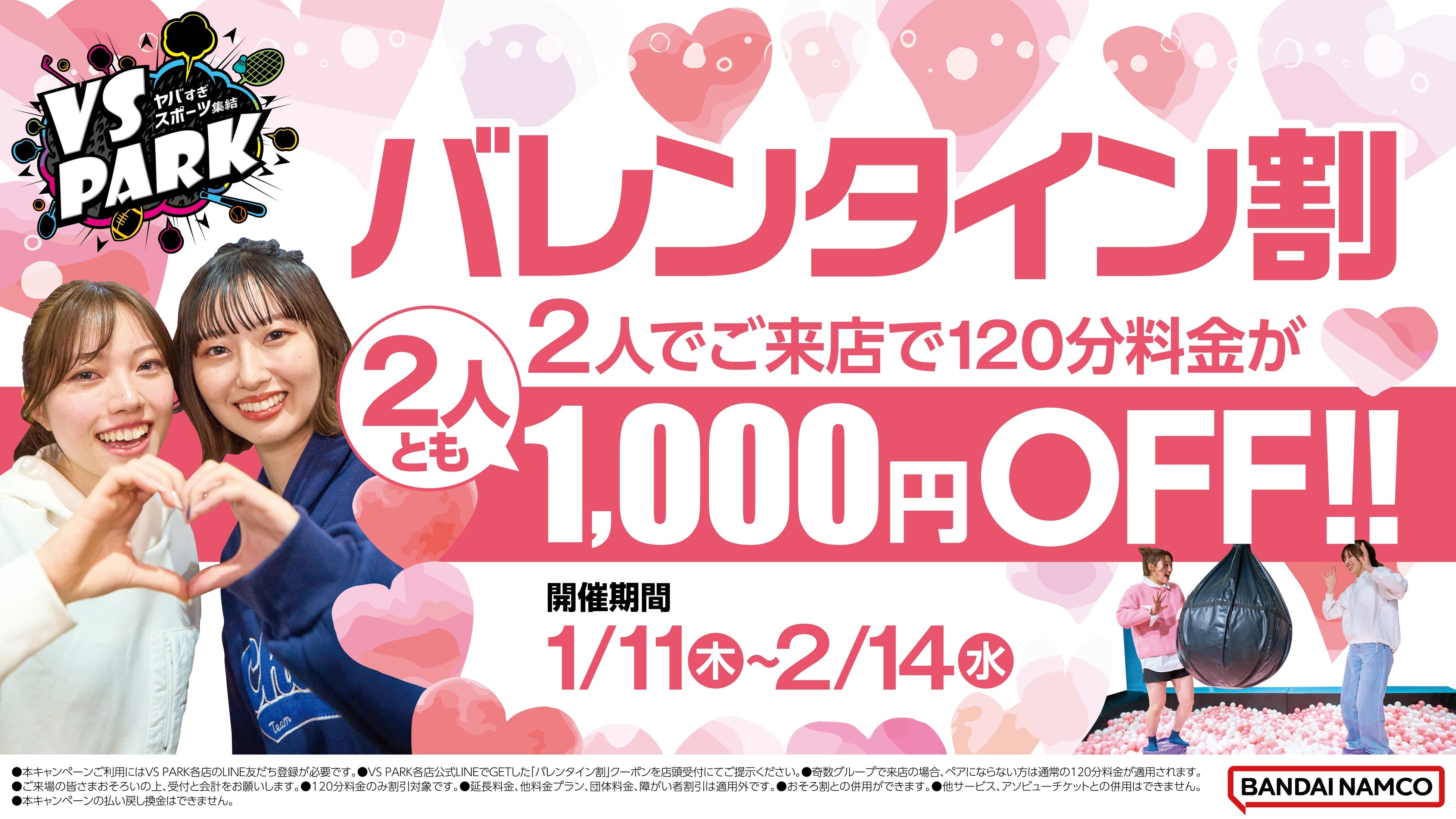 株式会社バンダイナムコアミューズメントが運営する屋内“ヤバすぎ”アクティビティ施設『VS PARK』では、2024年1月11日(木)から2月14日(水)までの期間、誰でも2人で来店すると、1人あたり1,000円引きになる「バレンタイン割」を開催します。