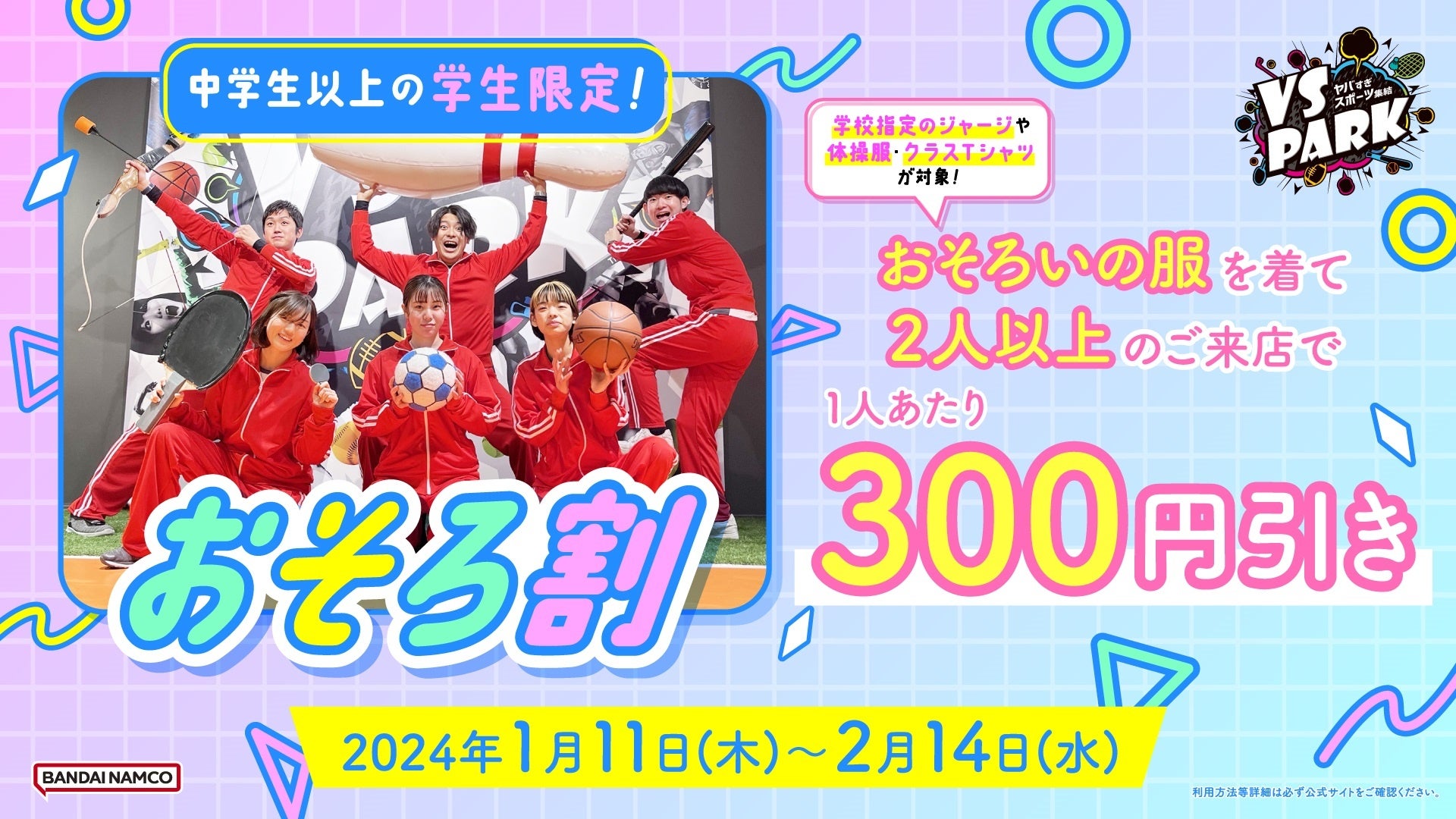 2人でおそろいの学校ジャージや体操服で来店すれば、「バレンタイン割」と合わせて1人1,300円引きと大変お得!放課後や週末は、友達を誘ってVS PARKで遊ぼう!